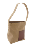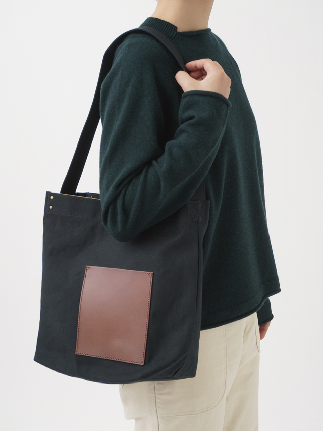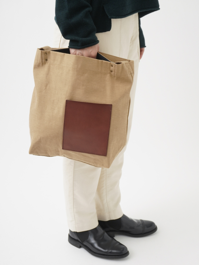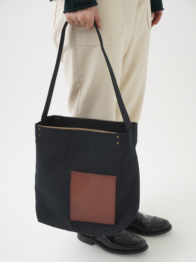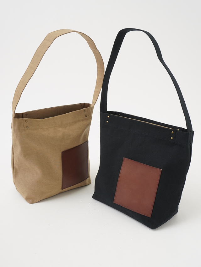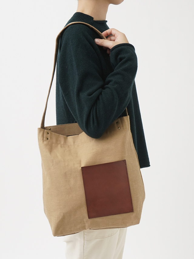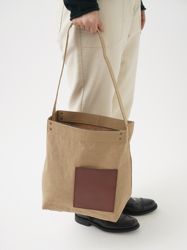 タテ糸には毛羽が少なく光沢のあるコーマ糸、ヨコ糸には落わたを混ぜ込んだ自然な風合いのラフィ糸を使い織り上げた生地を使用したショルダーバック。