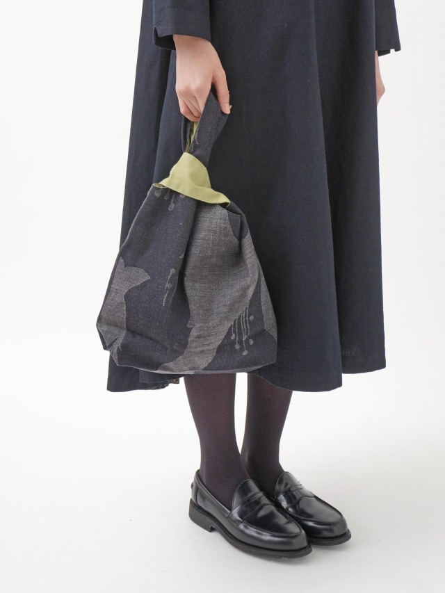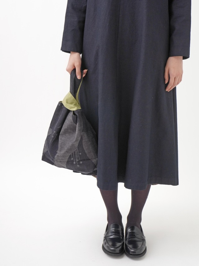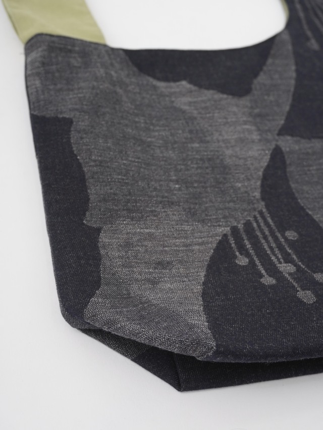 タテ糸にネイビーのラフィ綿染糸、ヨコ糸にブラウンのラフィウール糸を贅沢に使用し、ジャガード織りでケイトウの花を表現した、しっかりとした生地のバック。