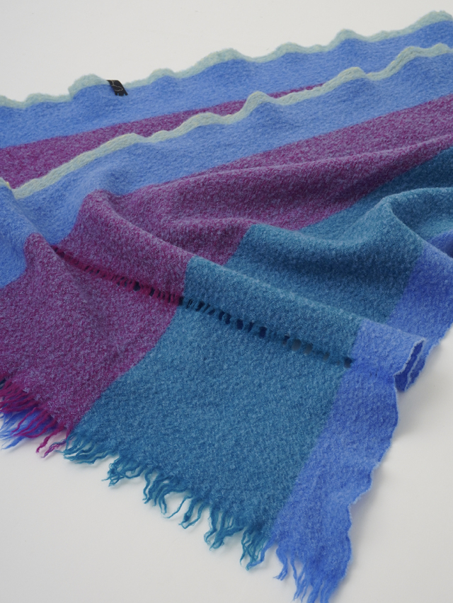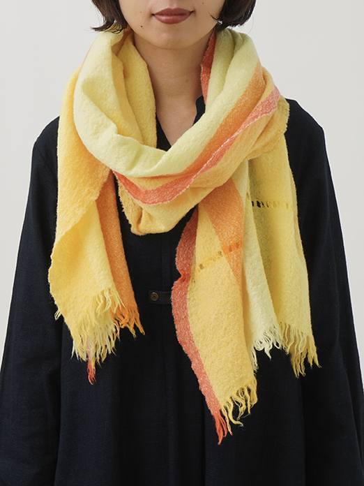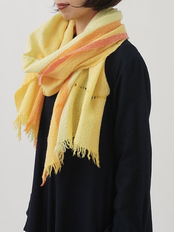 ゆっくりと時間をかけて甘く織り上げた後に、縮絨をかけることで現れる糸にまかせた自由な形と、巻いたときの動きがユニークで味わいのある、他にはない一枚です。