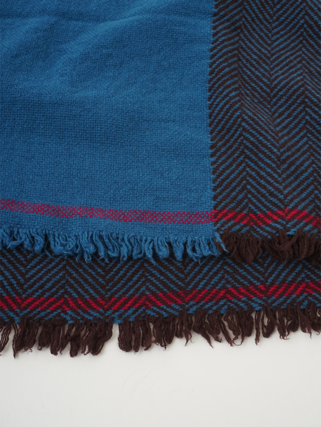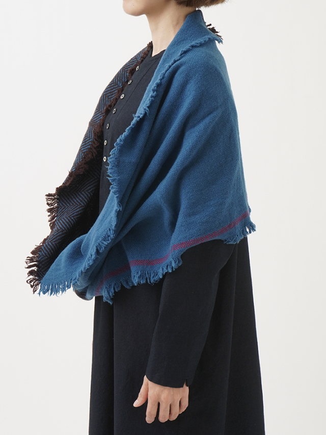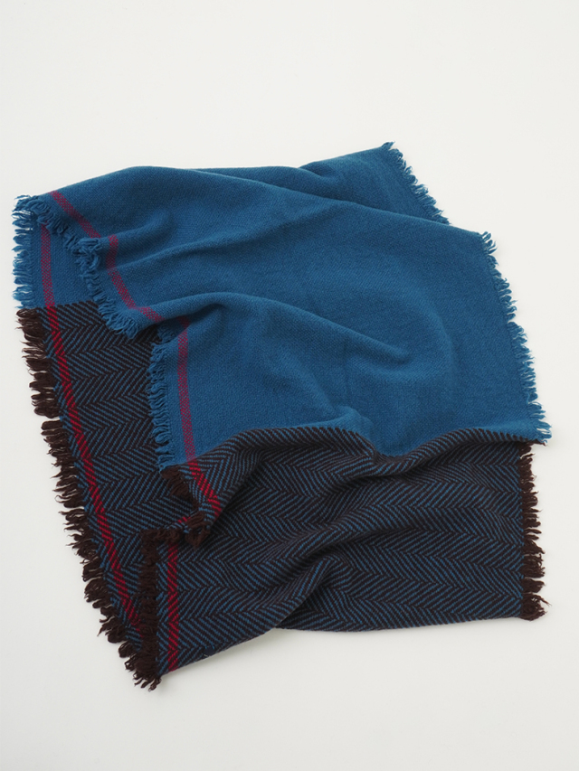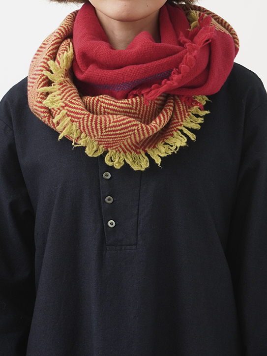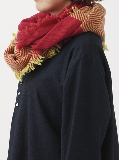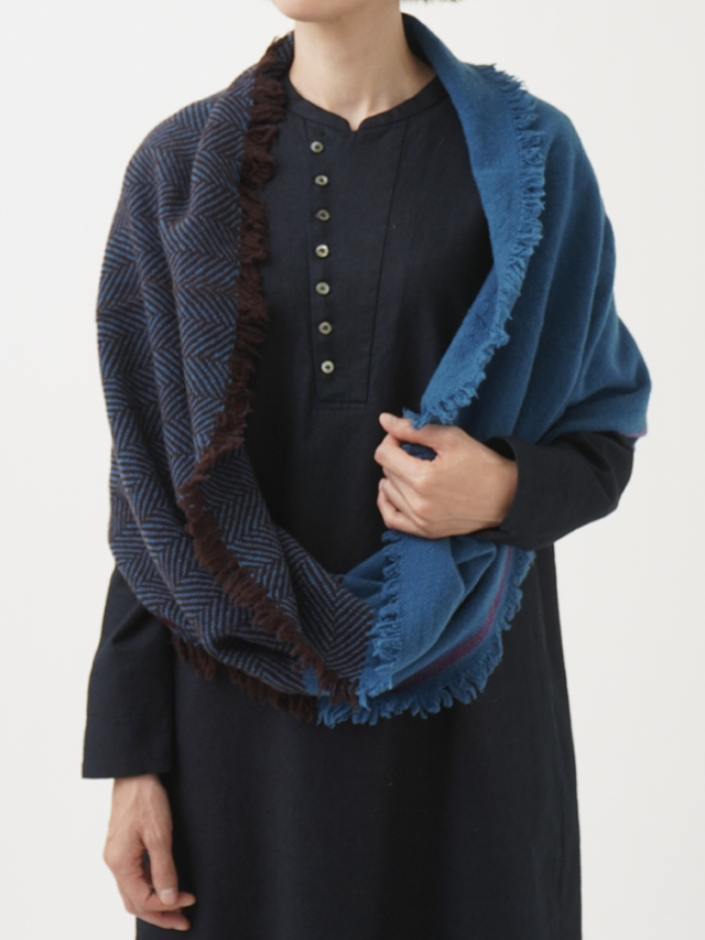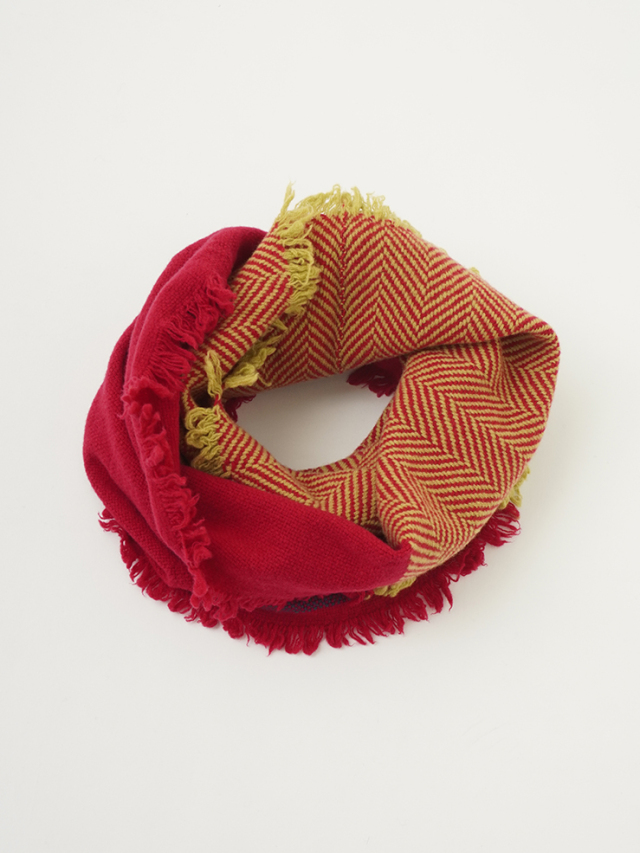 はんぶんの片方をバスケット織りの無地、もう片方をヘリンボン織りで切替えたスヌード。