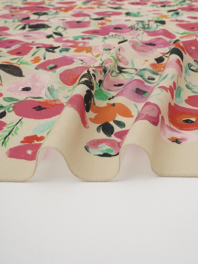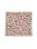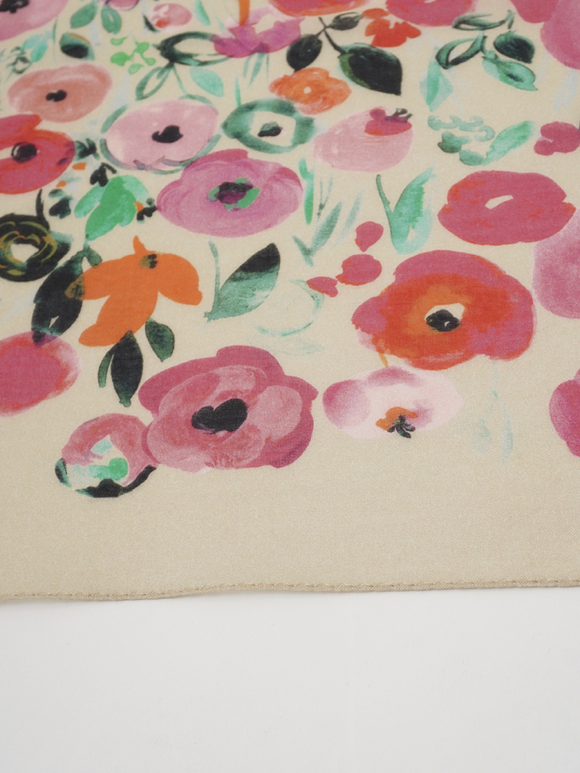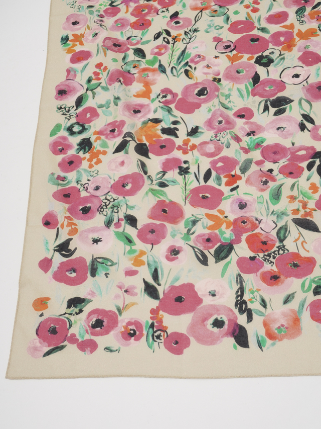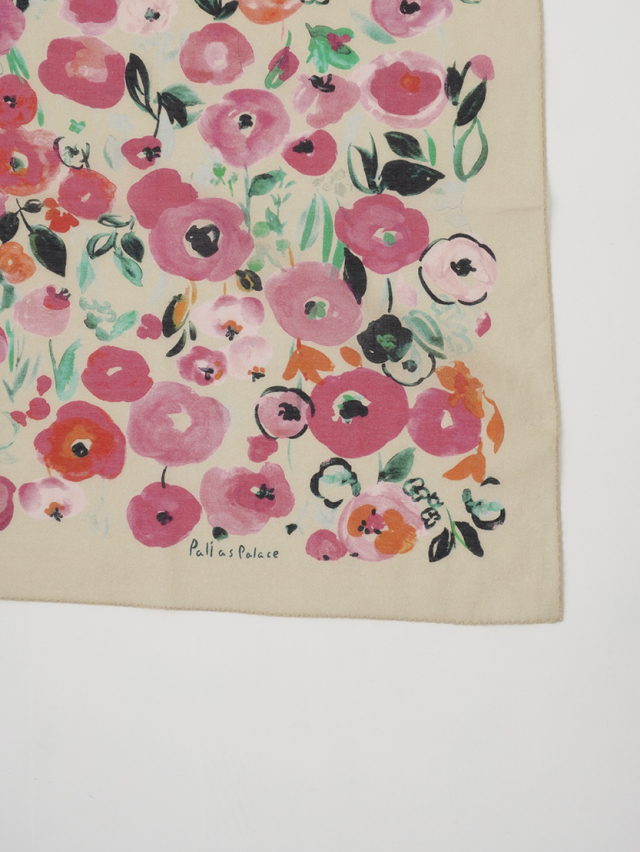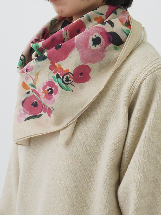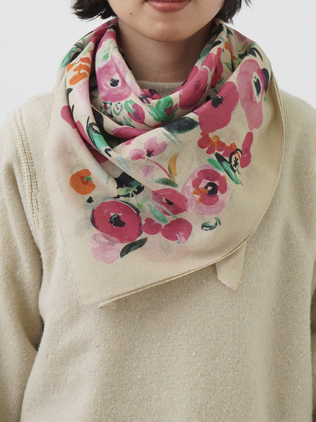 柔らかく肌に馴染みやすい綿ガーゼ素材に、水彩画のような色の濃淡が出る技法で表現した花柄のスカーフ。