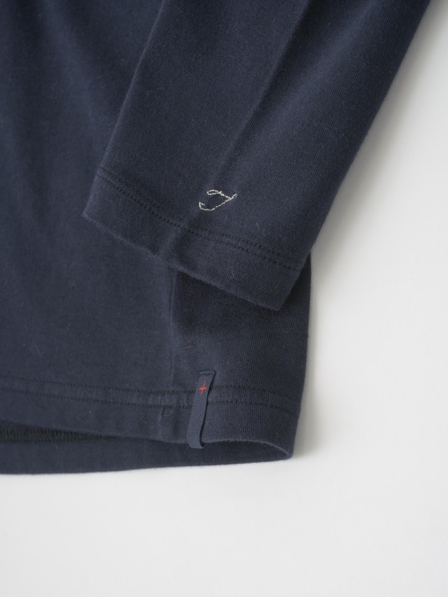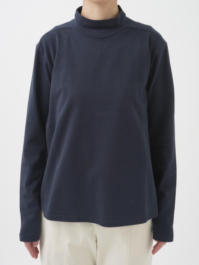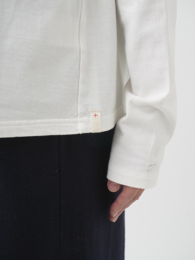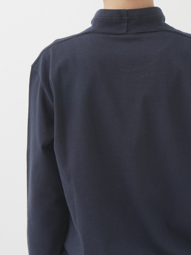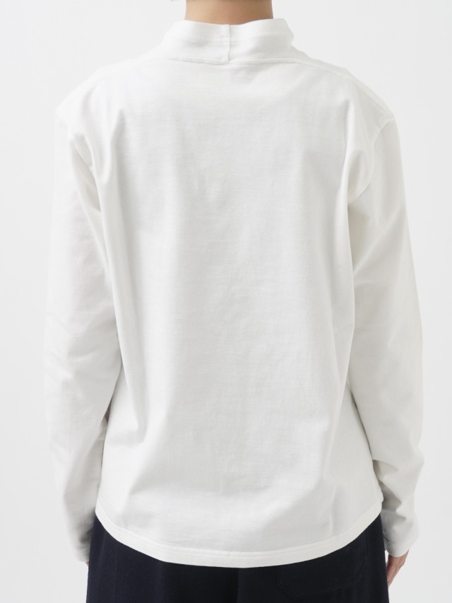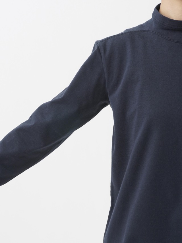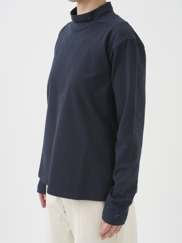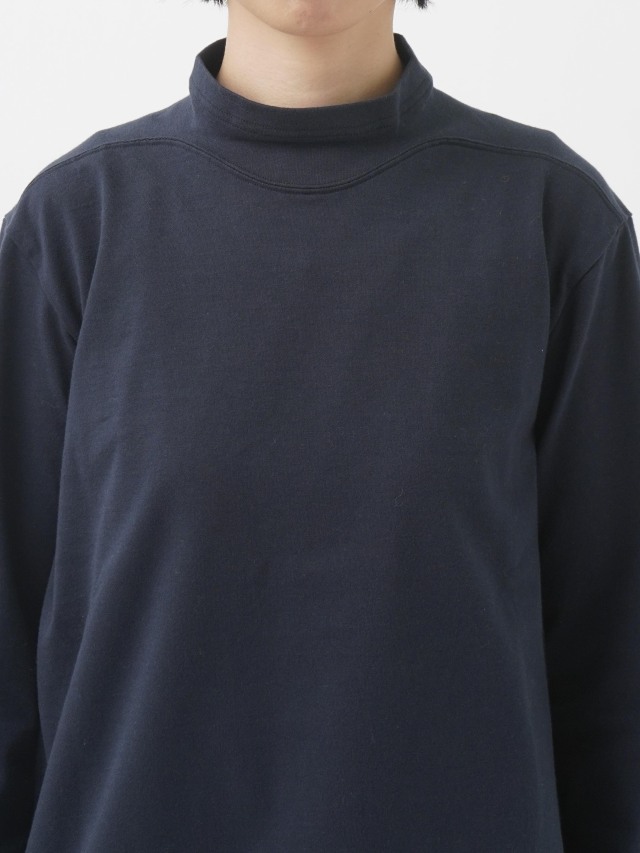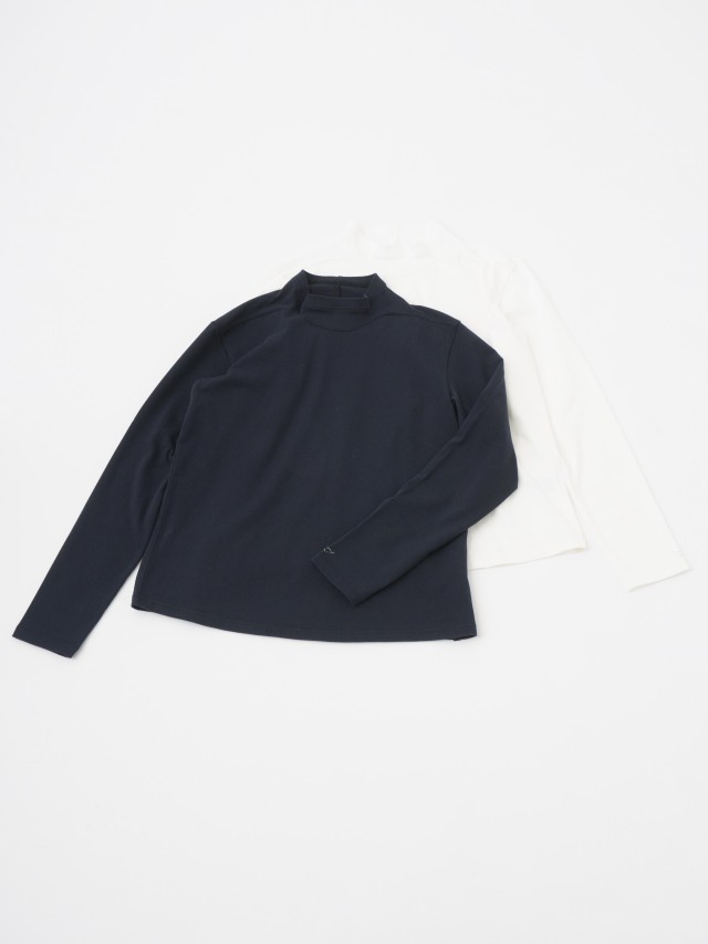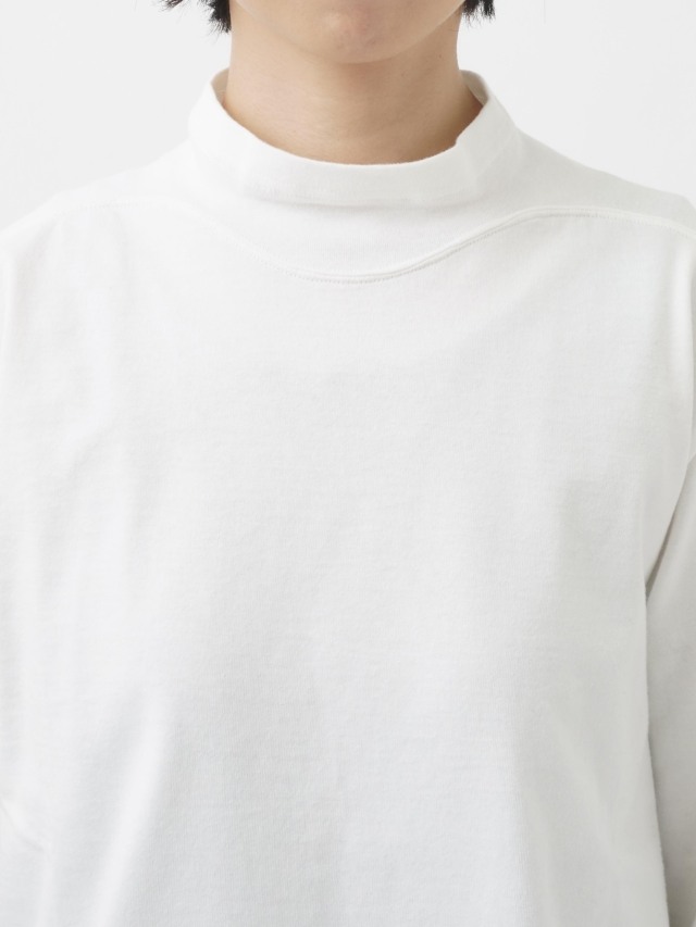襟を伸縮性のあるフライスに切替えた、なめらかなコットン素材のハイネックTシャツ。