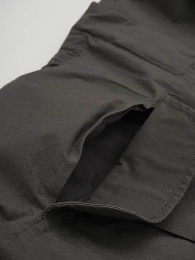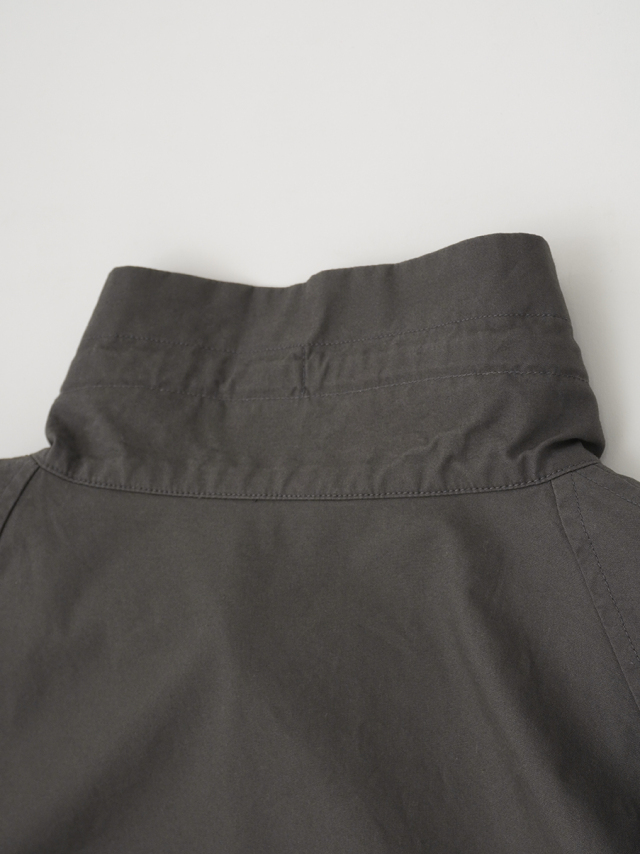糸の表面の毛羽を伏せて製造された綿糸を使用し、高密度に織った生地の表面を微細に起毛させた素材は、しっとりとした手触りと、風を通しにくいコシのある風合いが特徴です。
