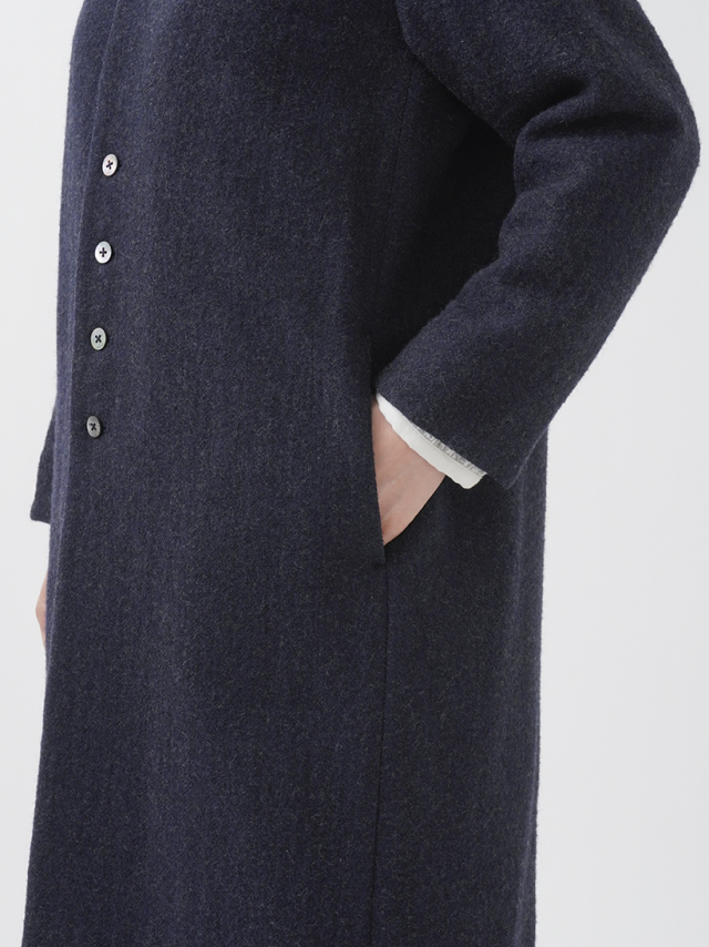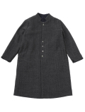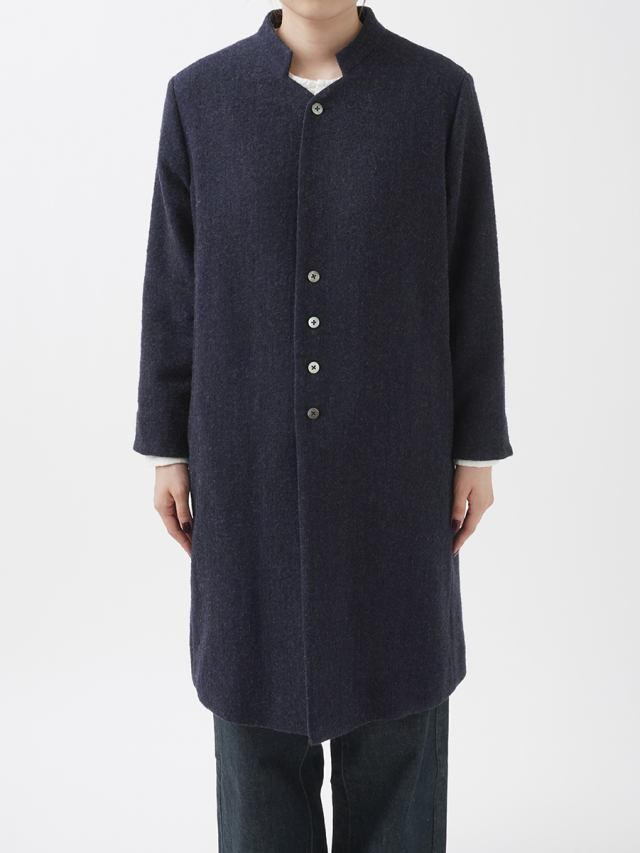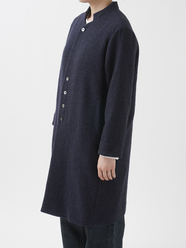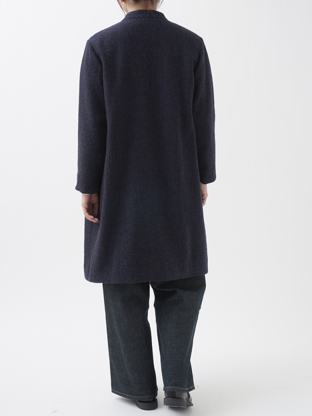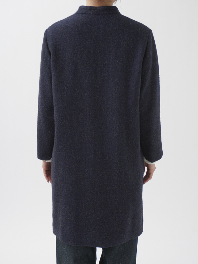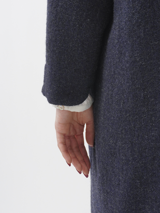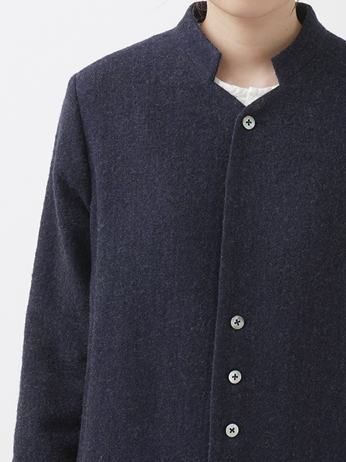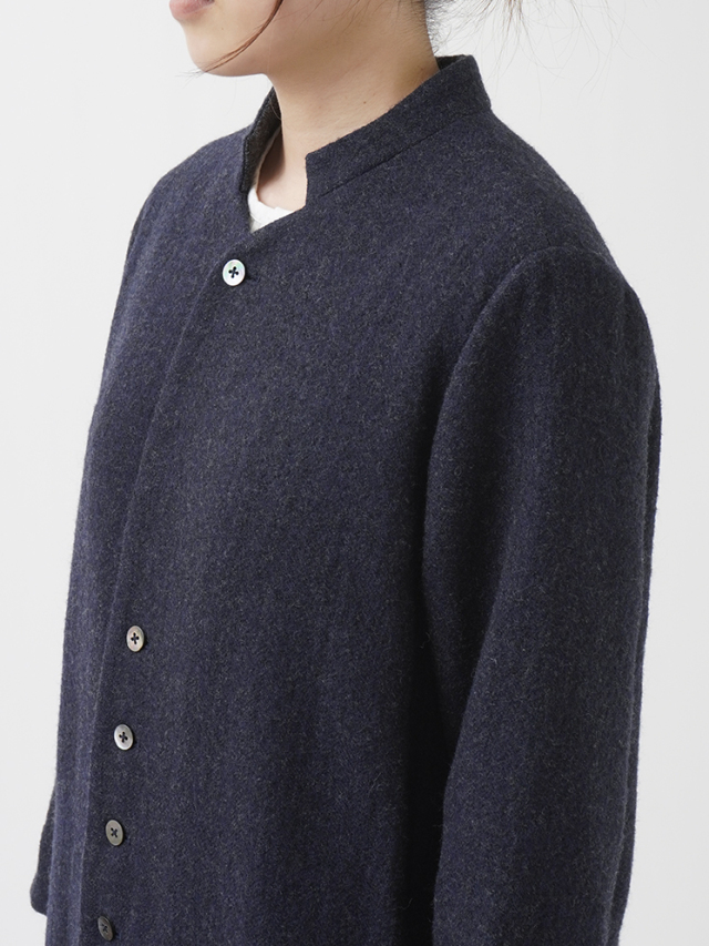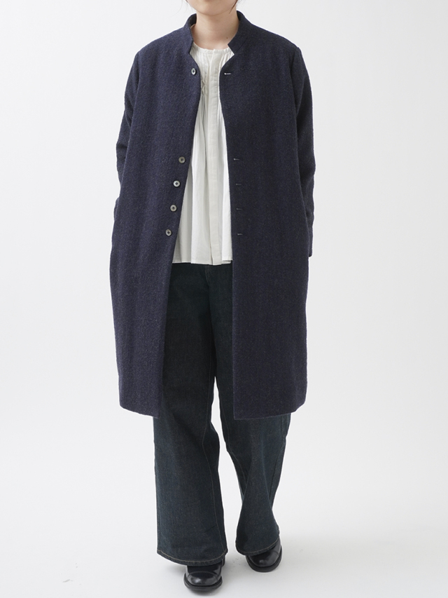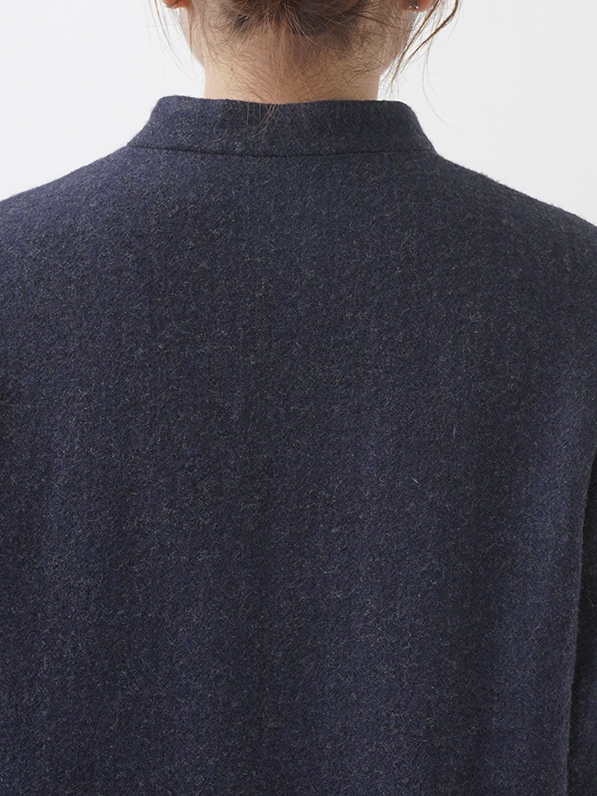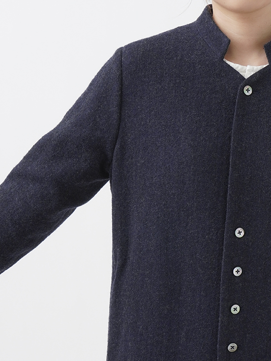 広がりを抑えた縦長シルエットとスタンド襟が、シンプルながら洗練された印象に。