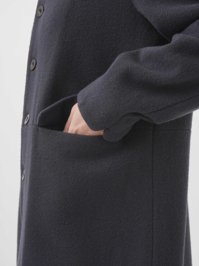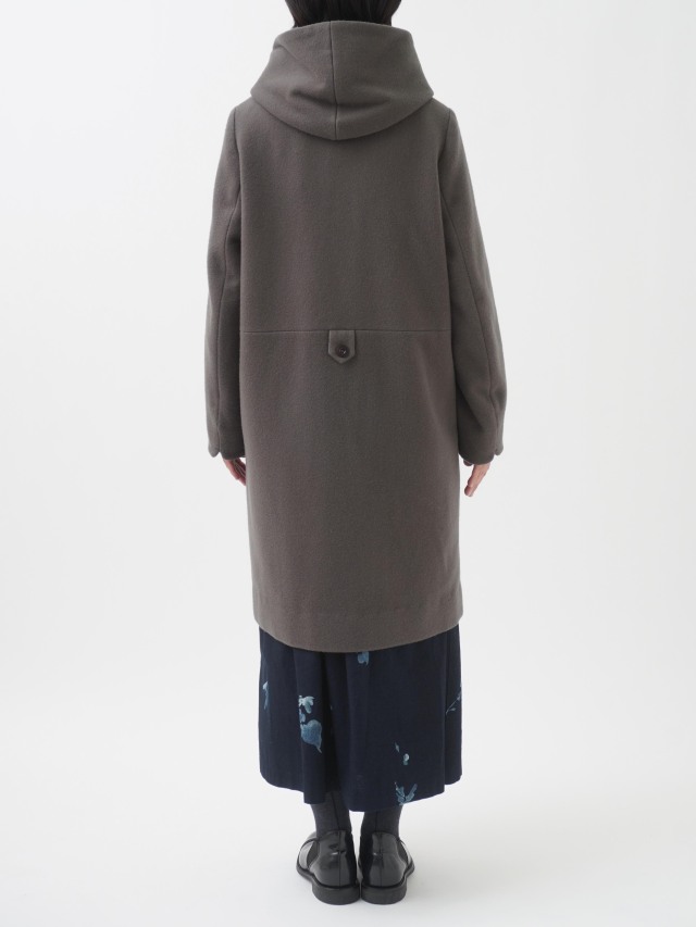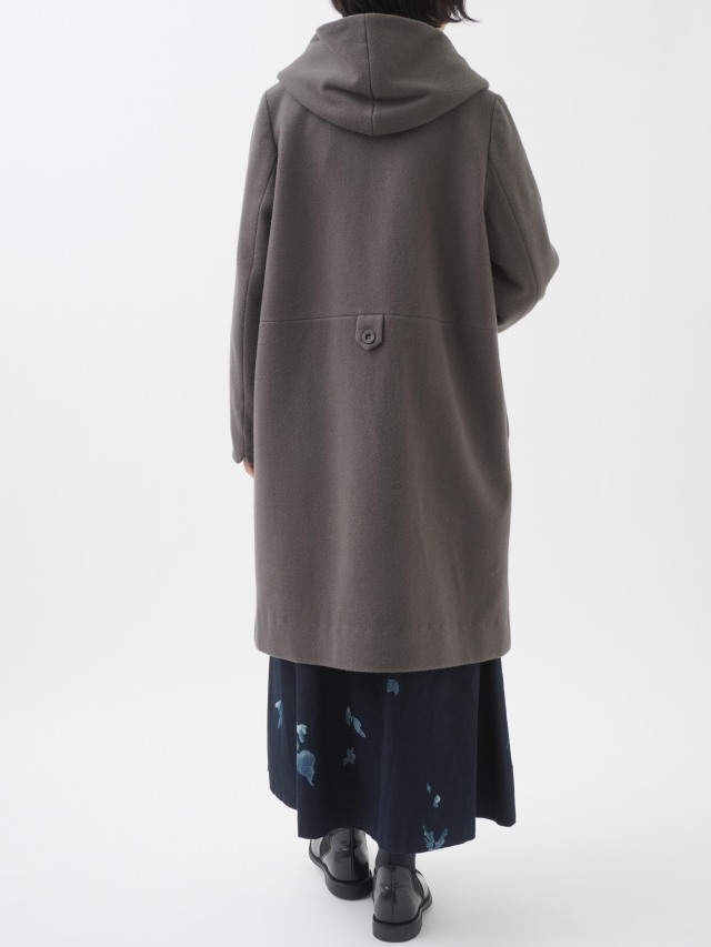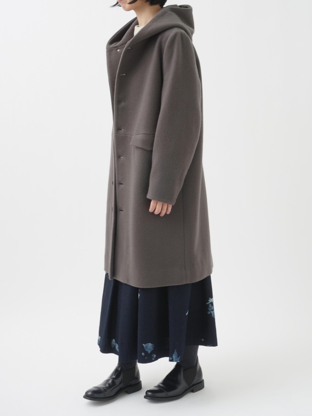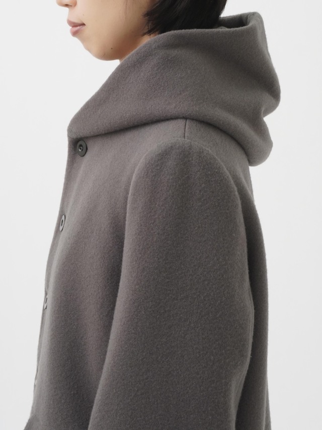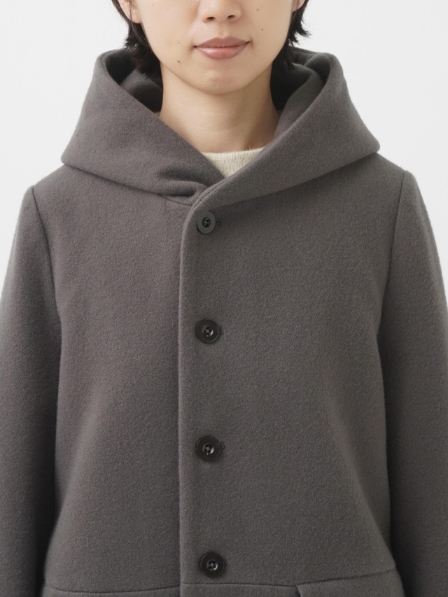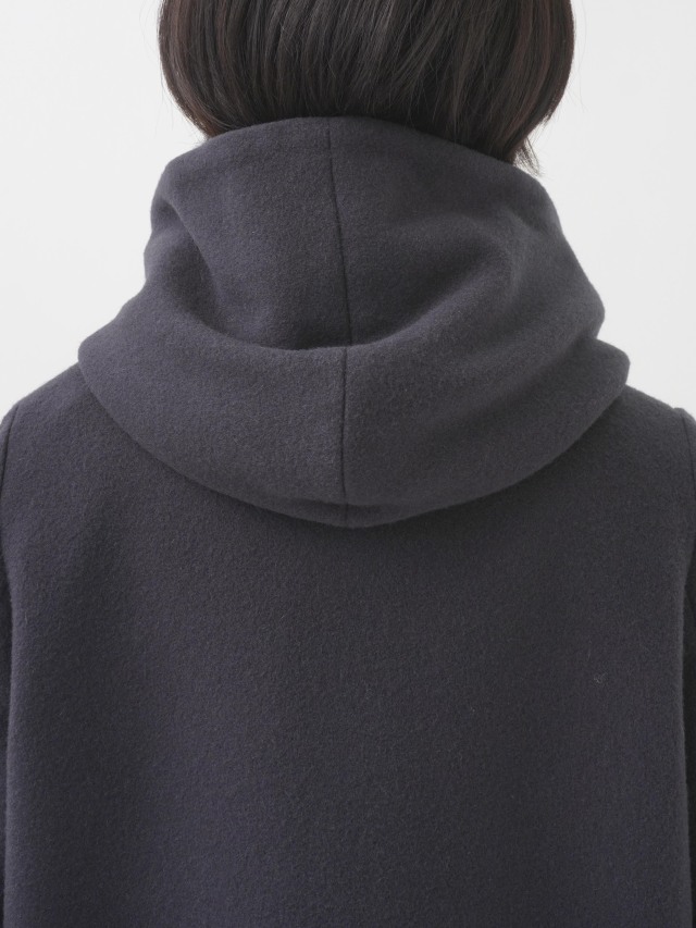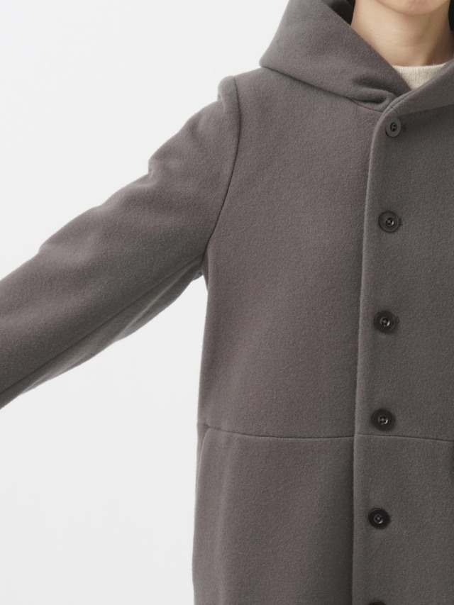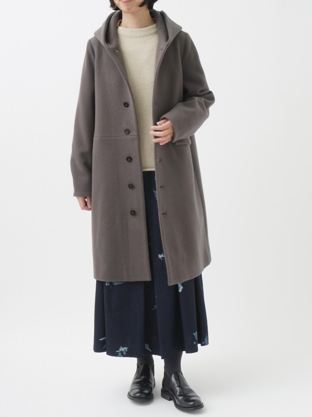 柔らかなラムウールを使用した 暖かさと軽さが特徴のフード付コート。