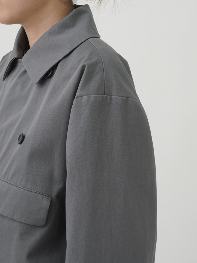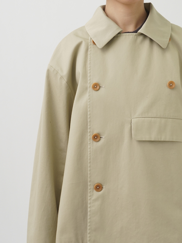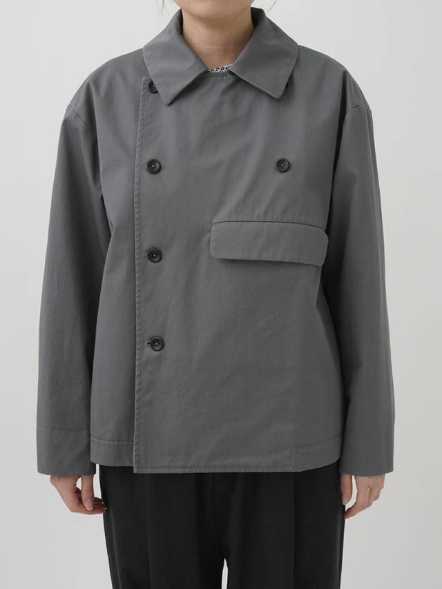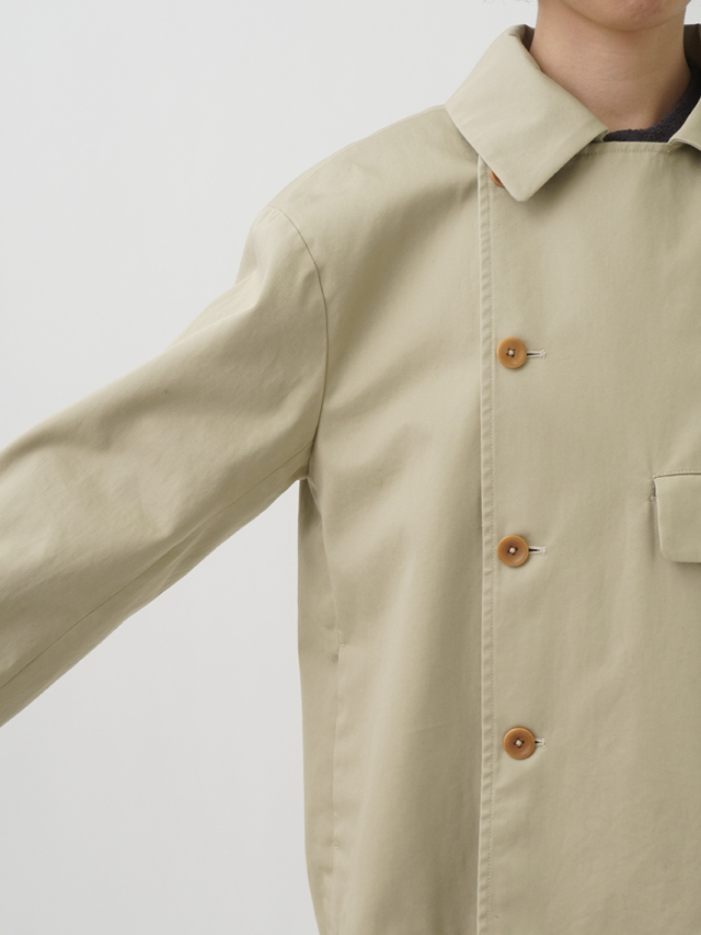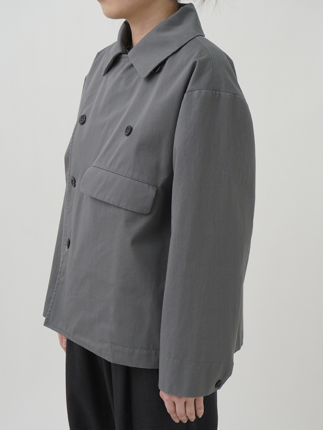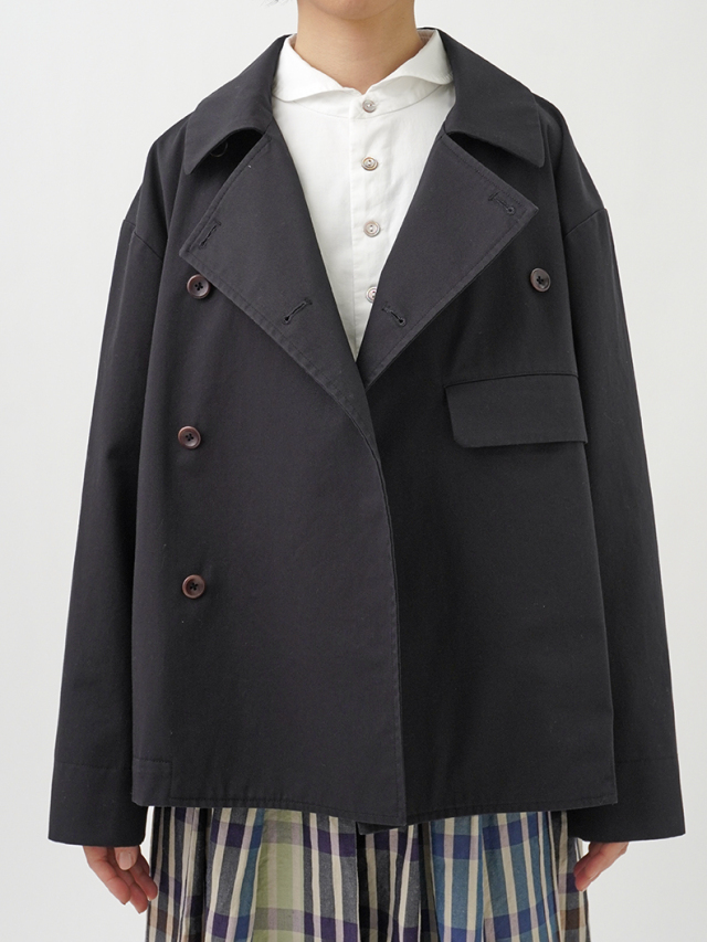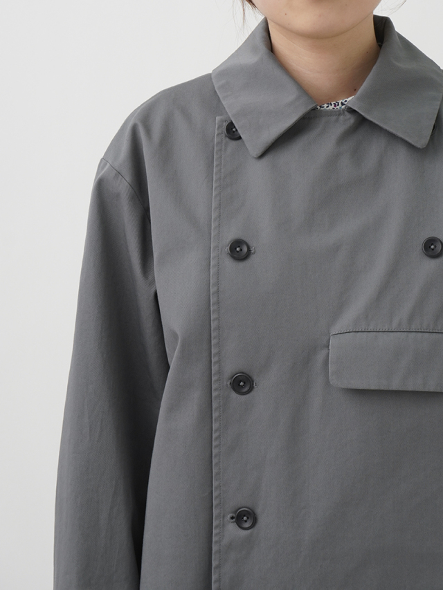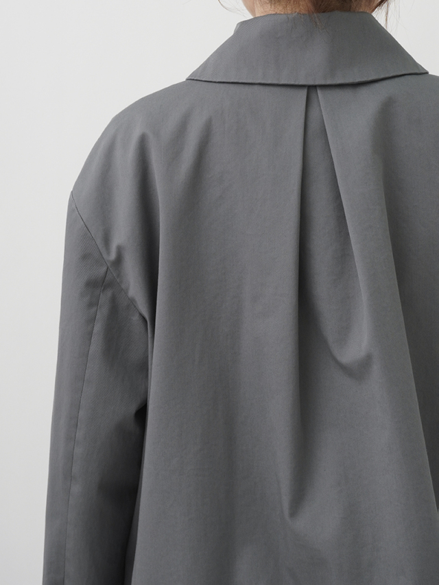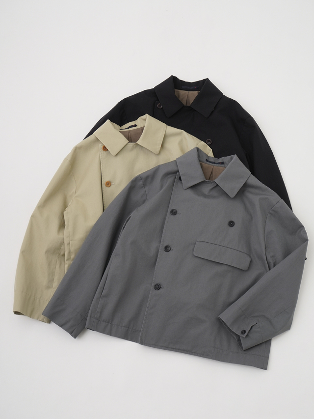 上品な光沢と、しなやかなドレープ感とハリのある風合いのコットンツイルを使用したショート丈コート。