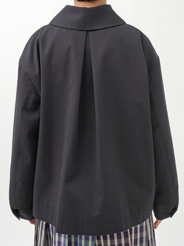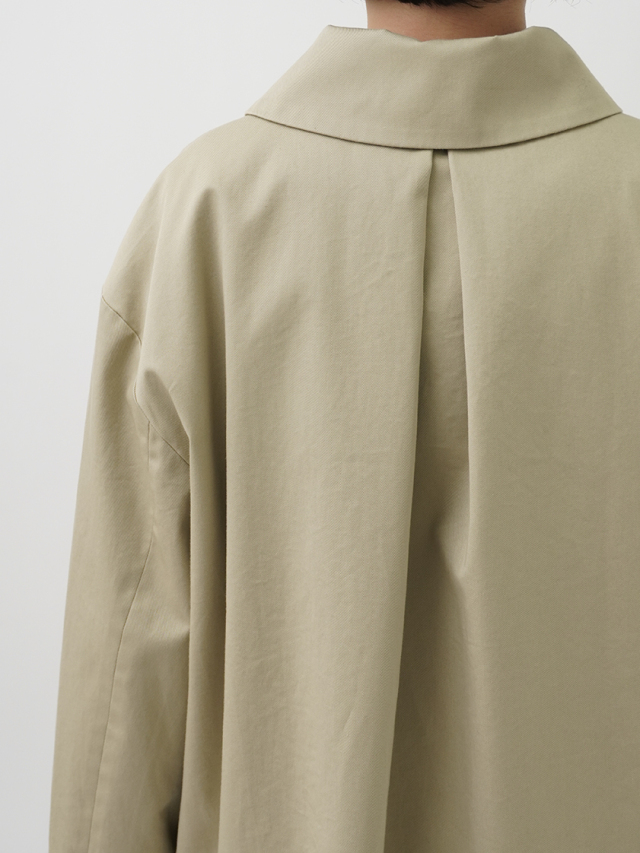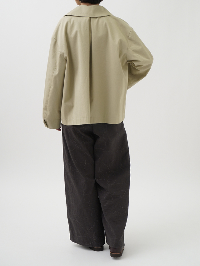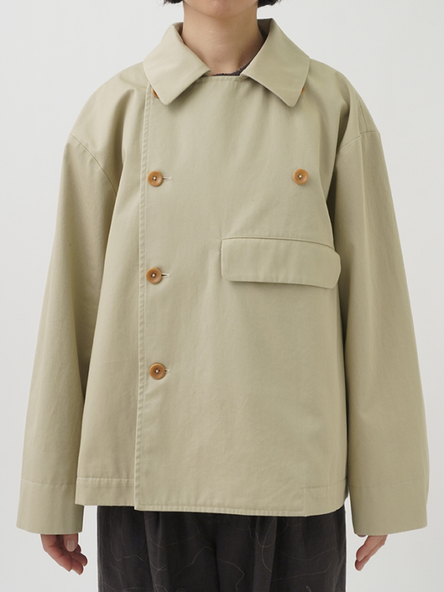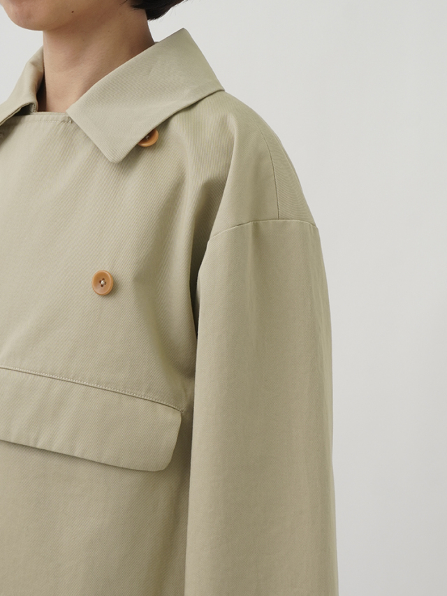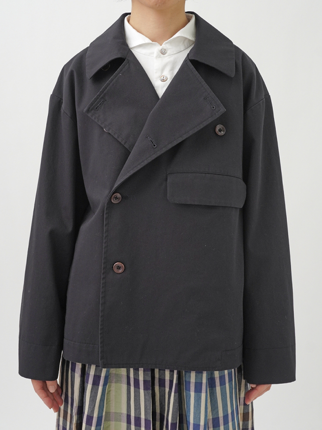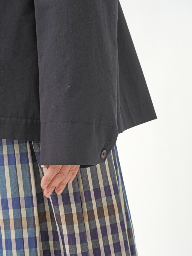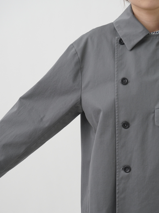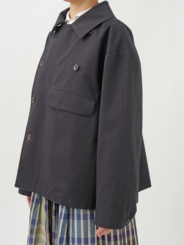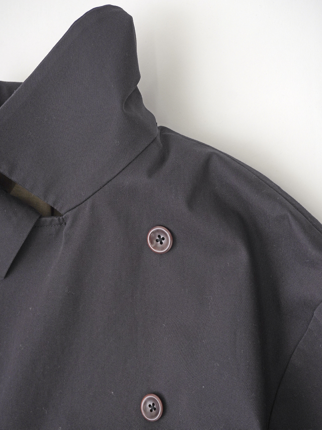 上品な光沢と、しなやかなドレープ感とハリのある風合いのコットンツイルを使用したショート丈コート。