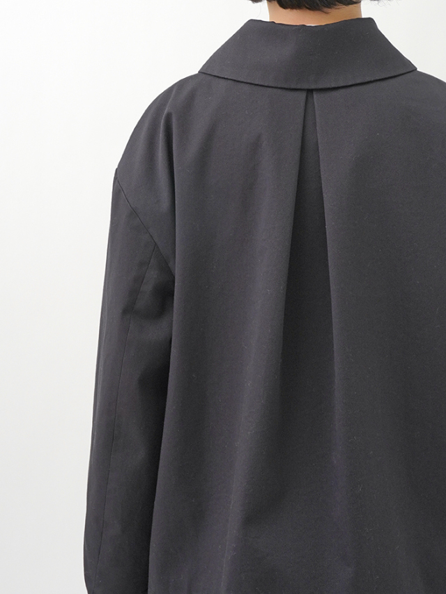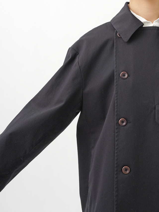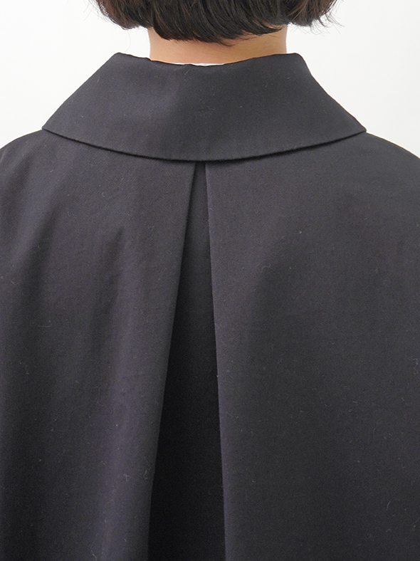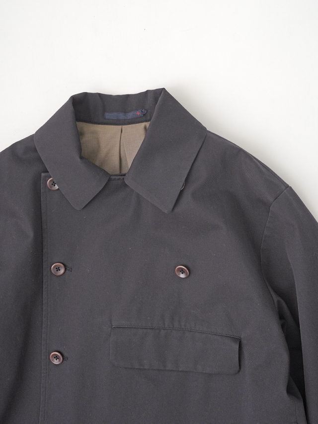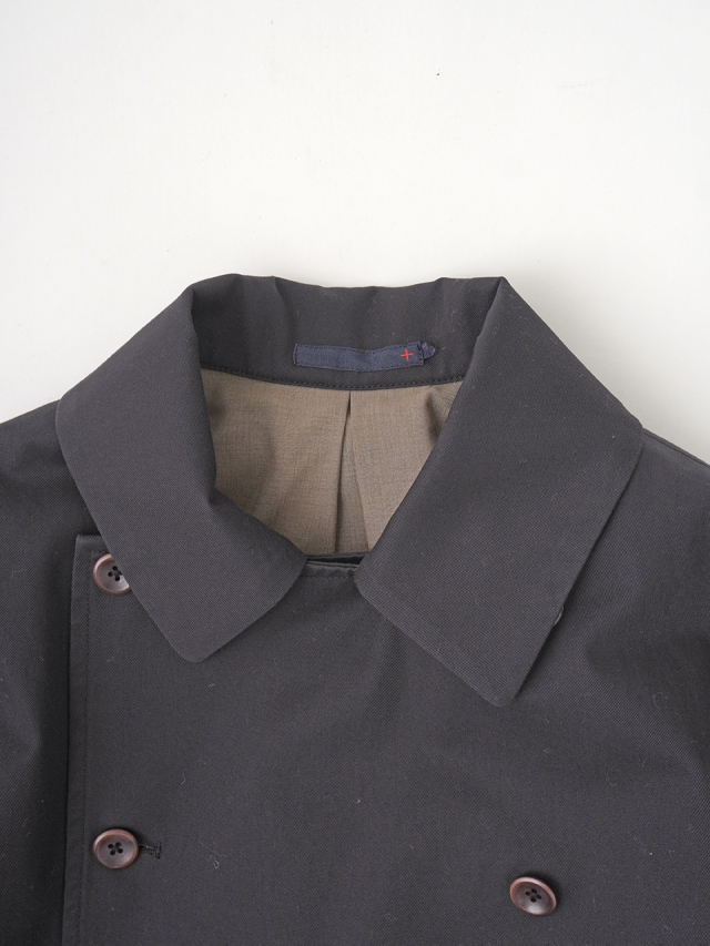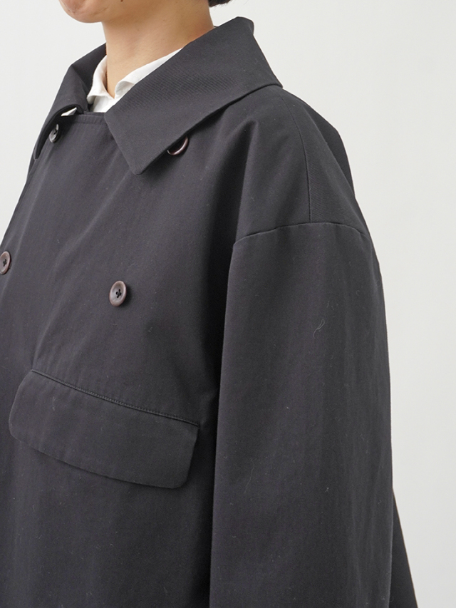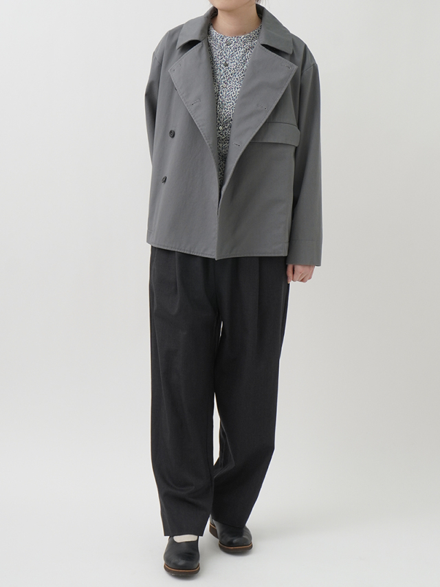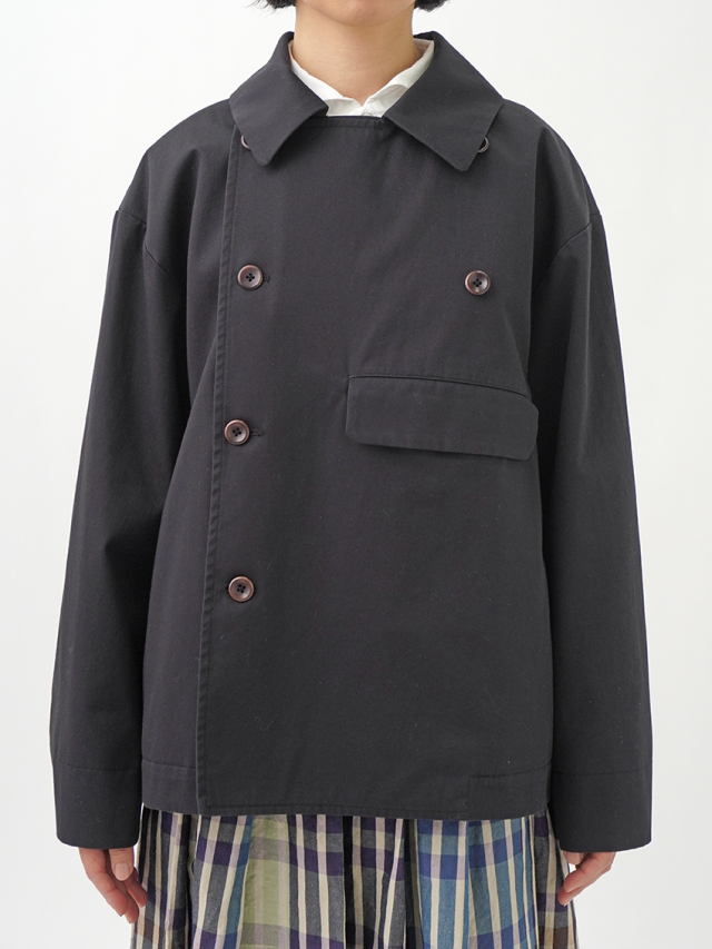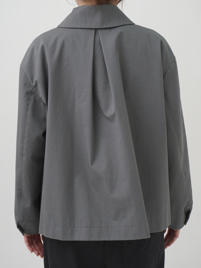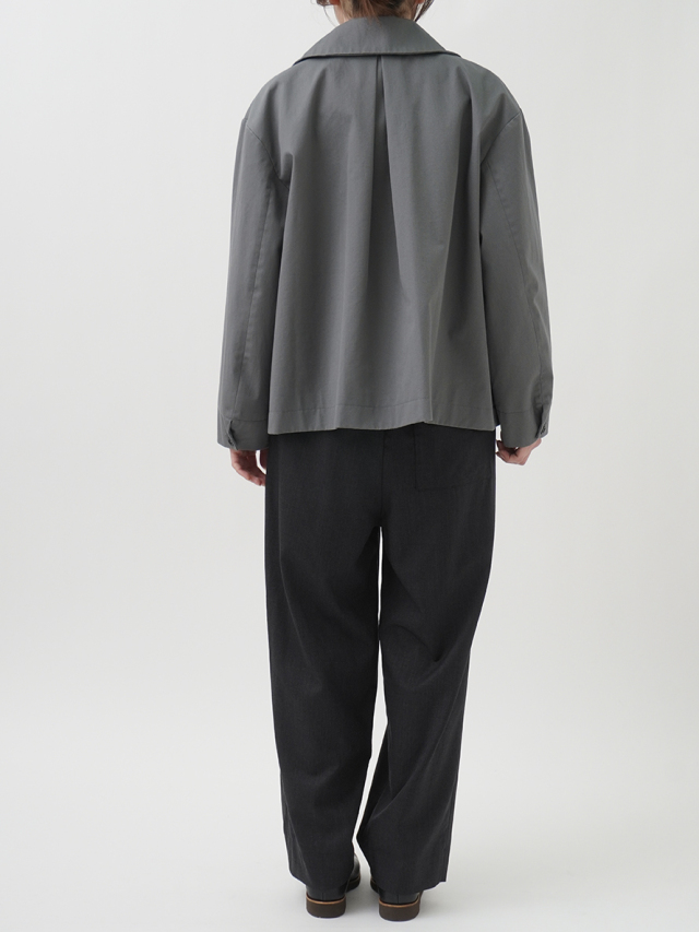 上品な光沢と、しなやかなドレープ感とハリのある風合いのコットンツイルを使用したショート丈コート。