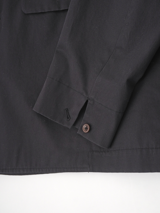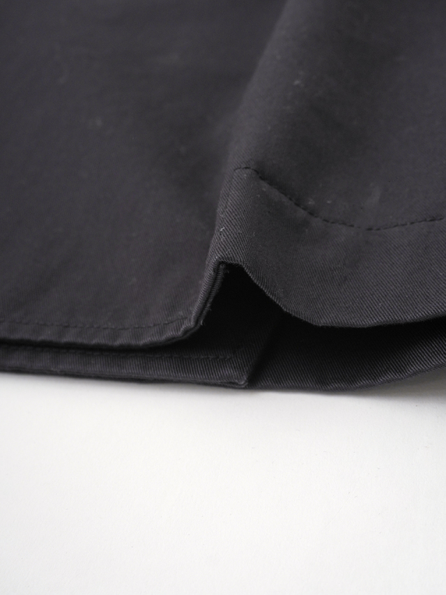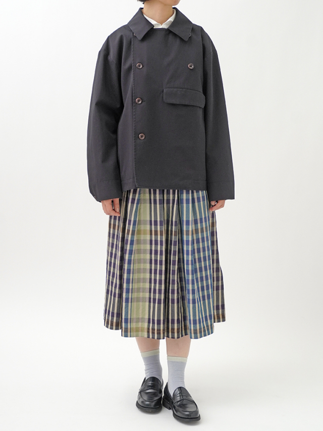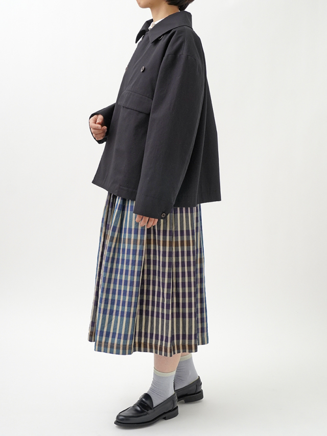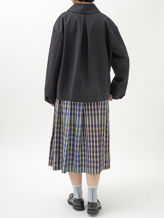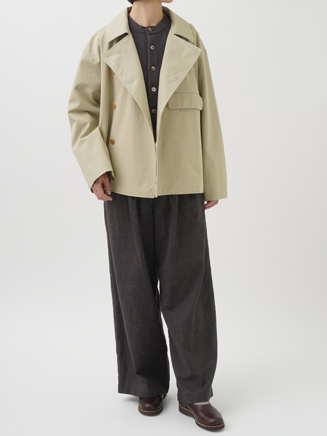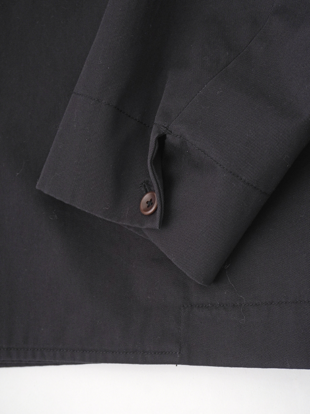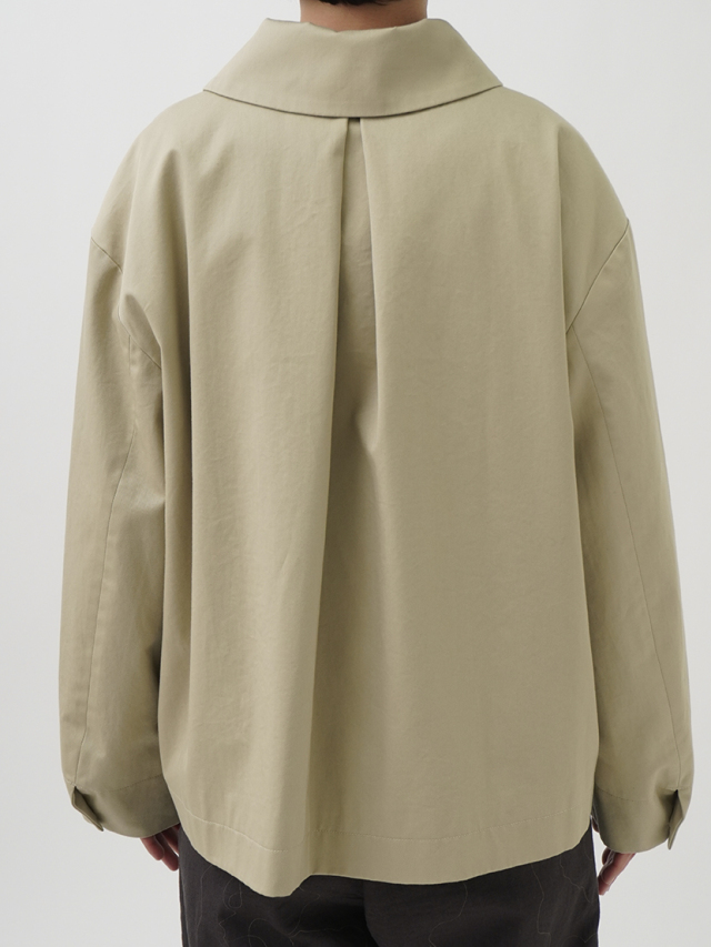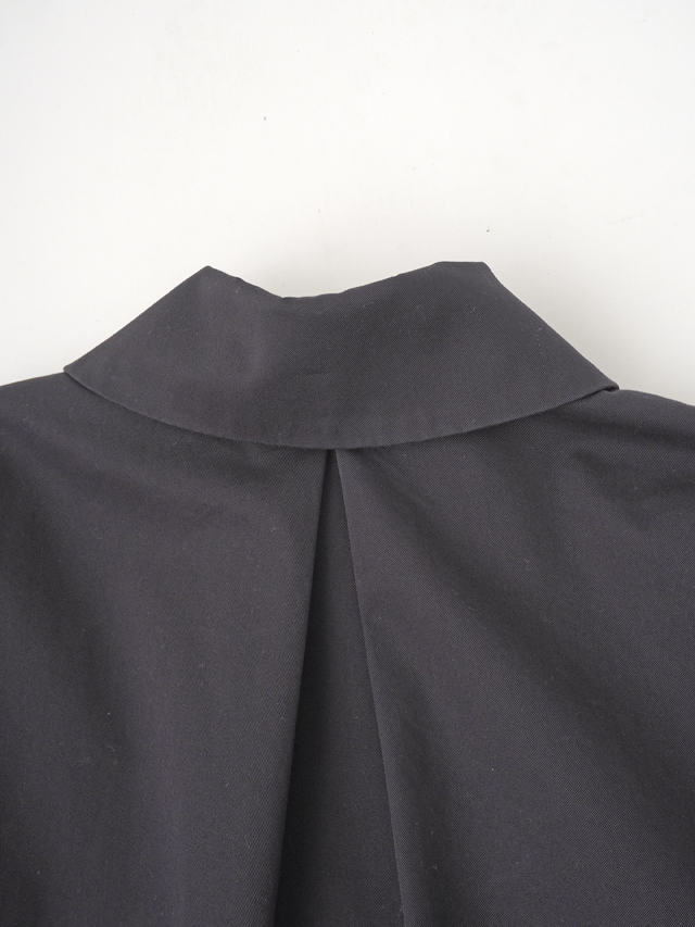 上品な光沢と、しなやかなドレープ感とハリのある風合いのコットンツイルを使用したショート丈コート。