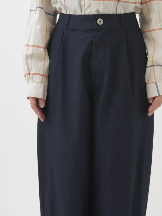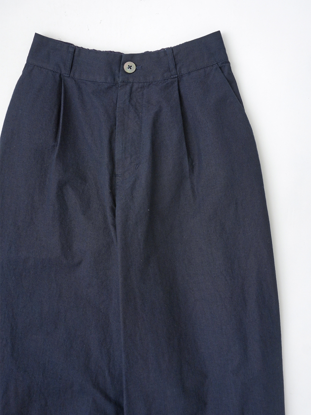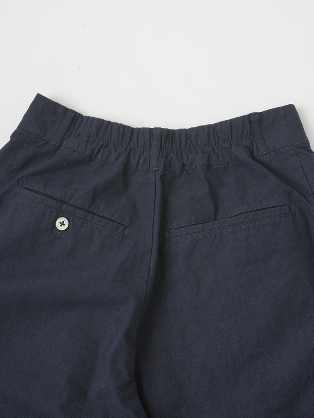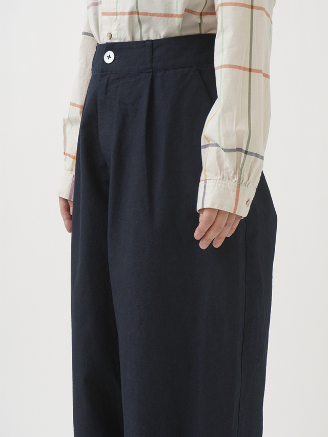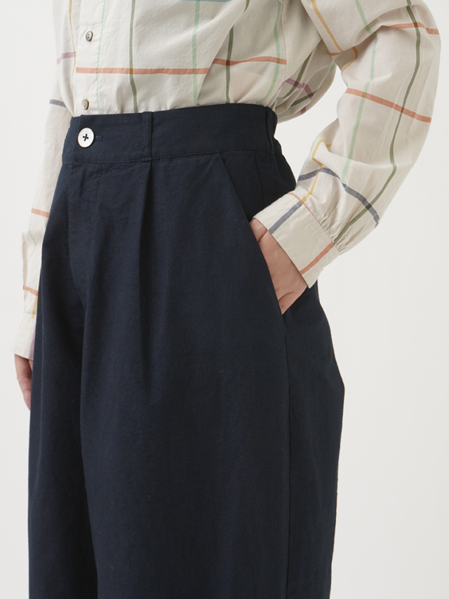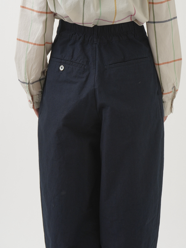 軽やかな素材に後ろウエストゴムを入れた、リラックス感のある履き心地です。