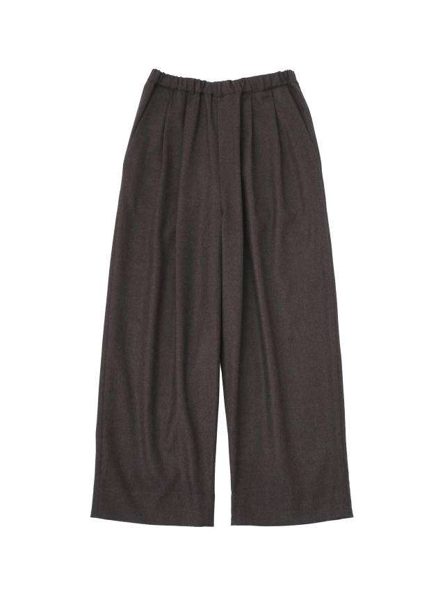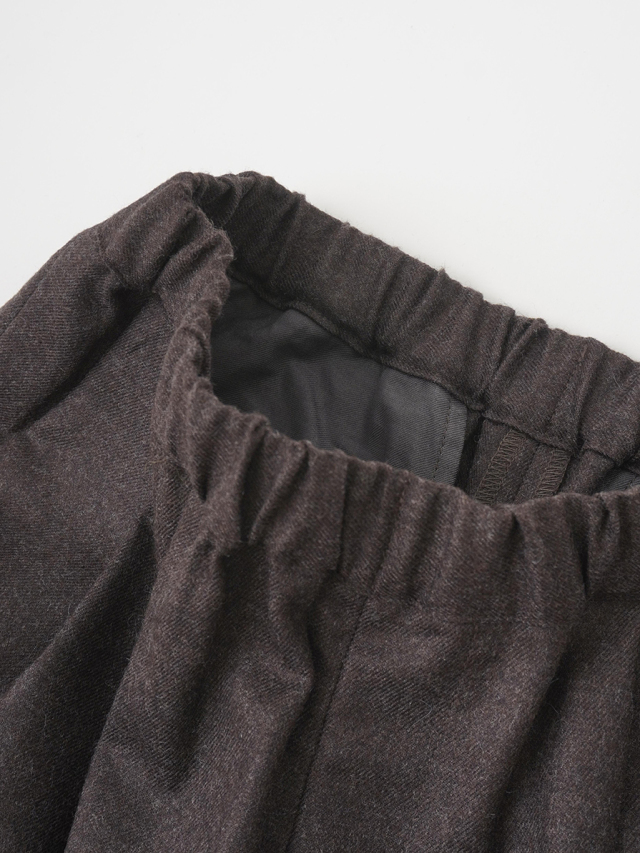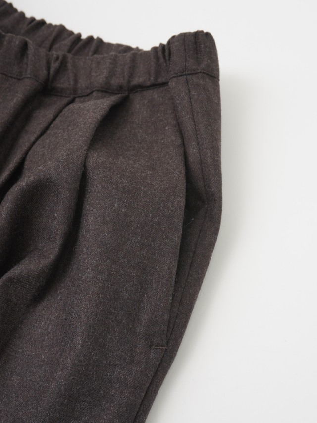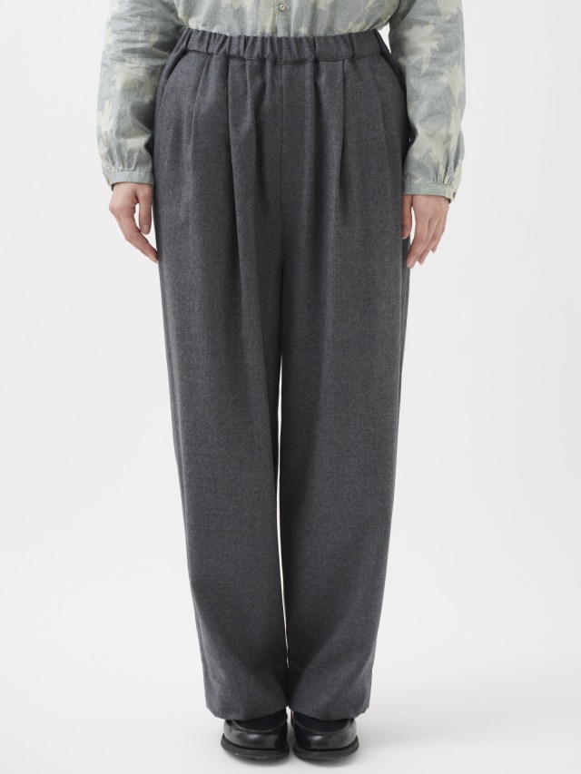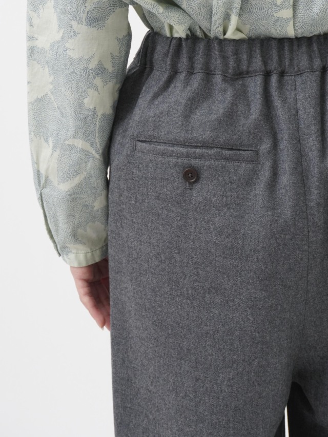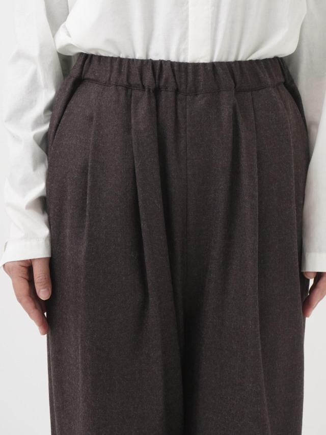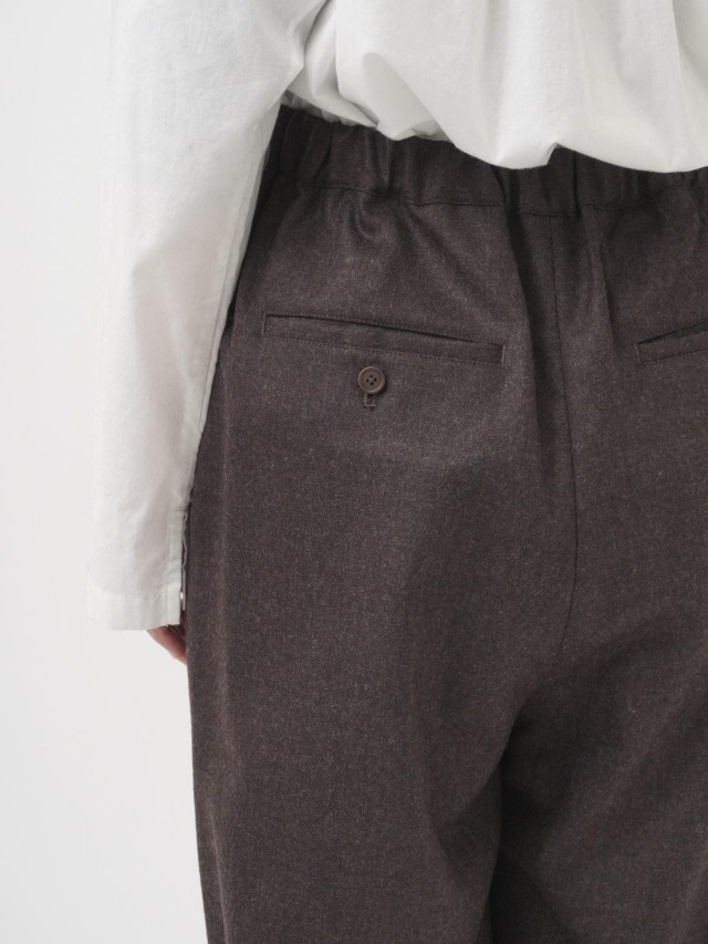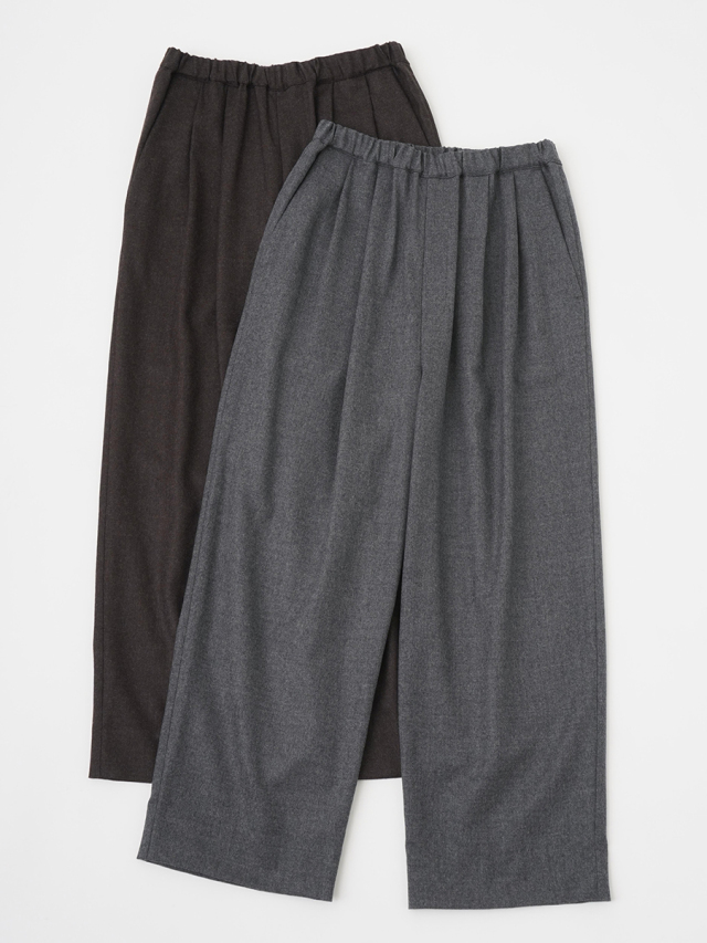 落ち感のある風合いが脚のラインをきれいに見せつつ、ウエストゴム仕様でリラックスした履き心地です。