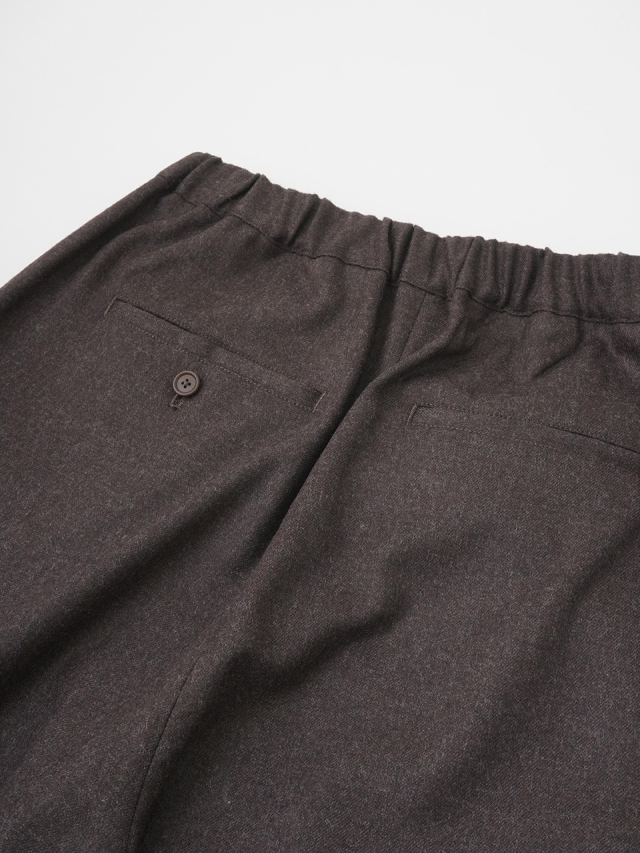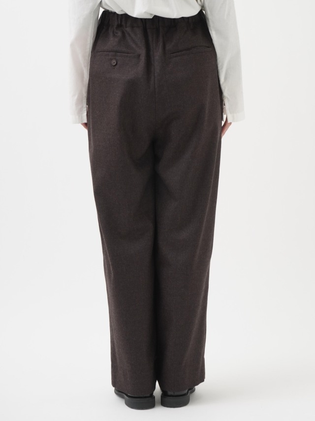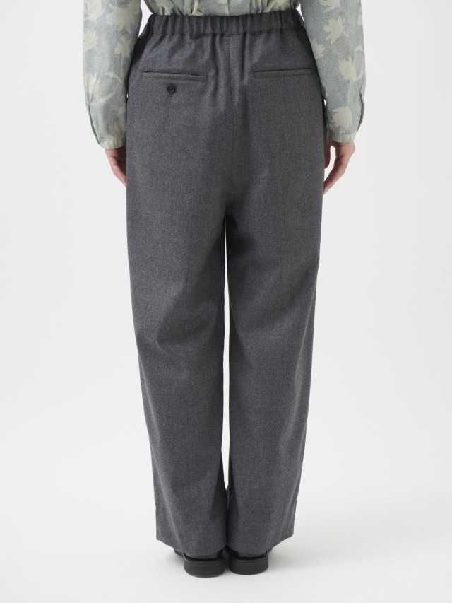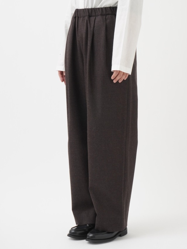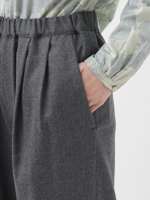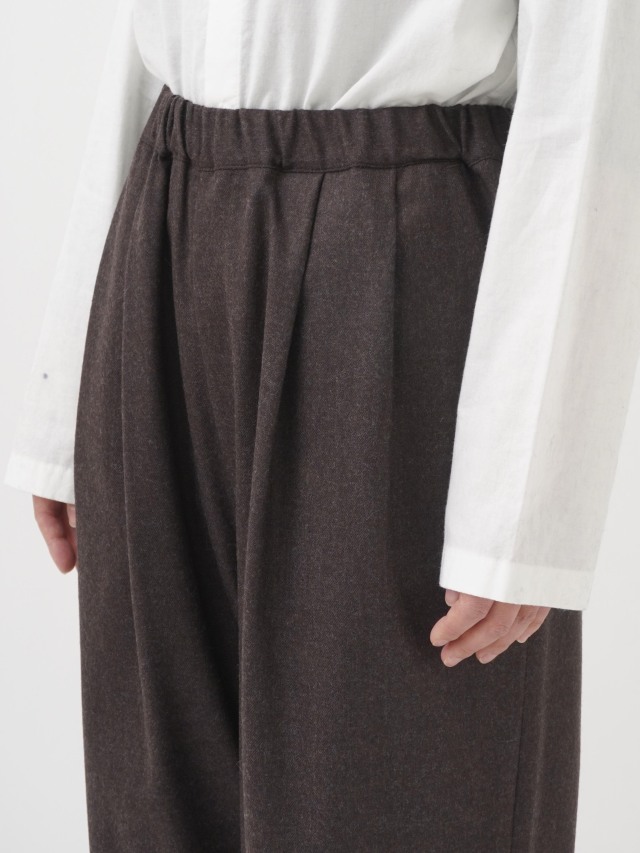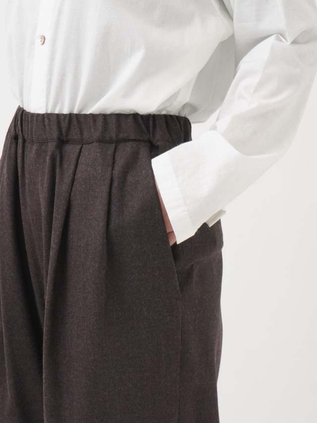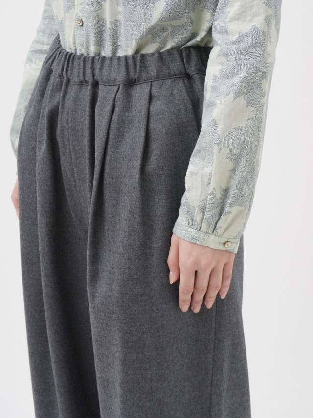 落ち感のある風合いが脚のラインをきれいに見せつつ、ウエストゴム仕様でリラックスした履き心地です。