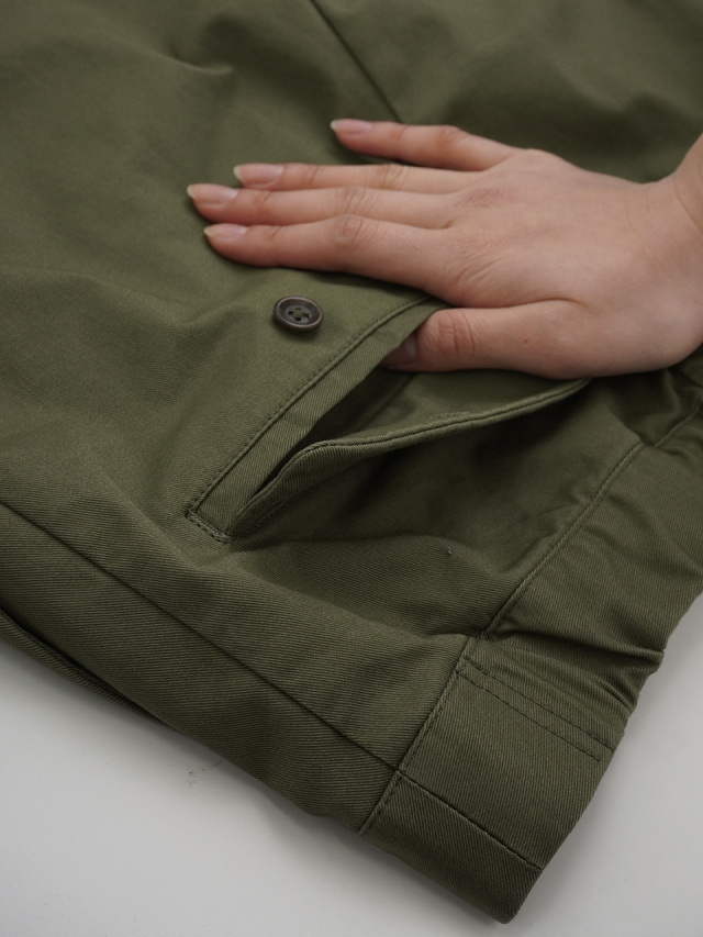 高密度に織られたコットンチノを、起毛加工を施す「ラファ―機」という機械で微起毛した、しっとりとした肌ざわりとマットな質感の生地です。