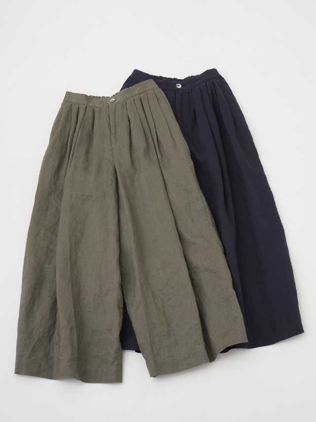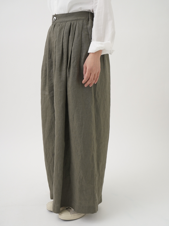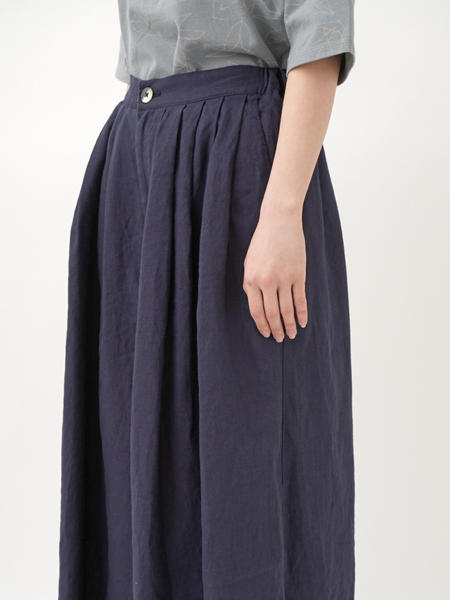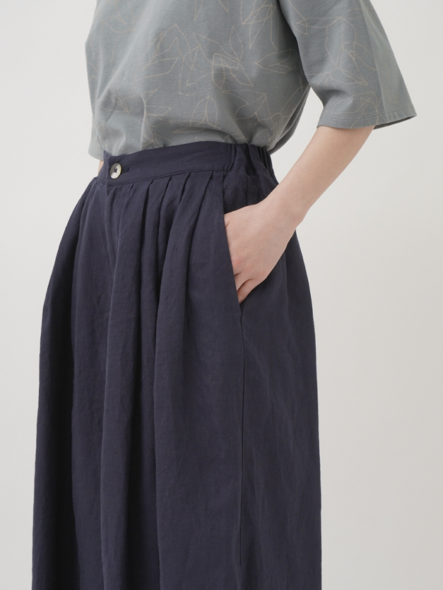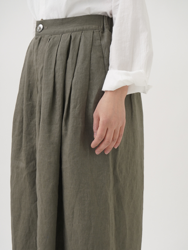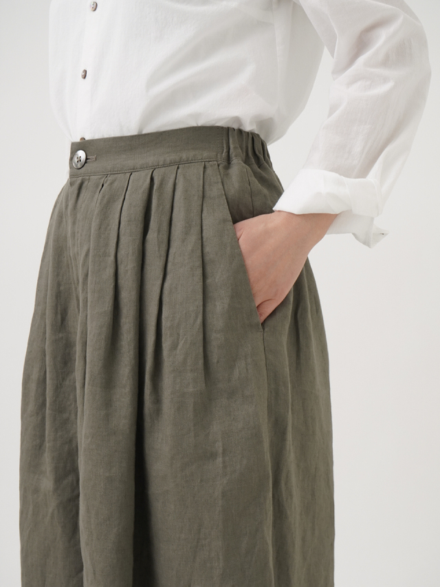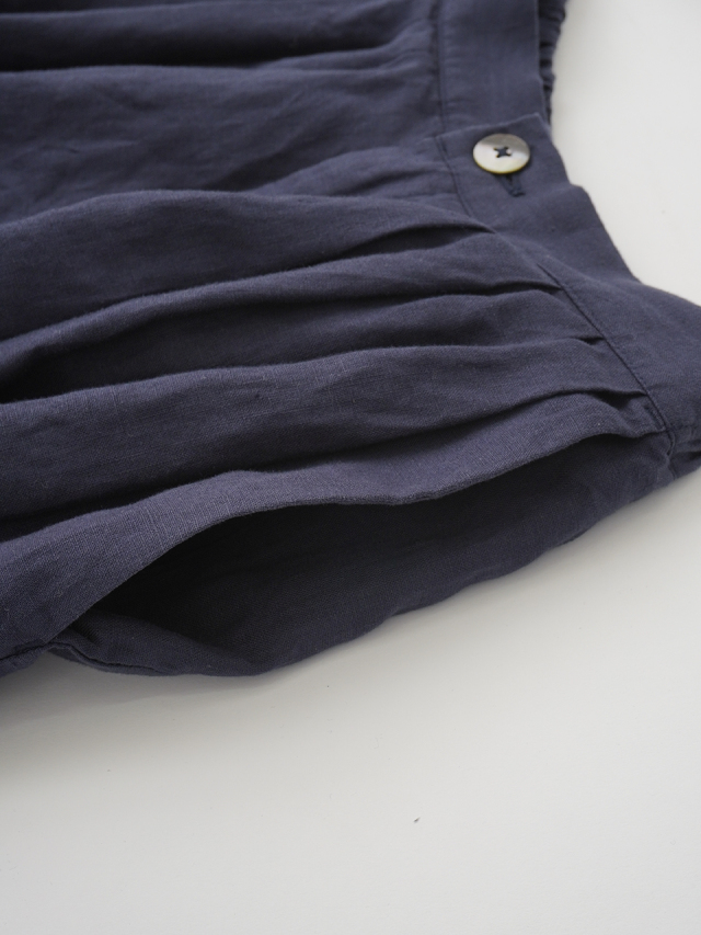 前ウエストまわりにタックを細かく入れた、スカートのように広がる立体的なシルエット。
