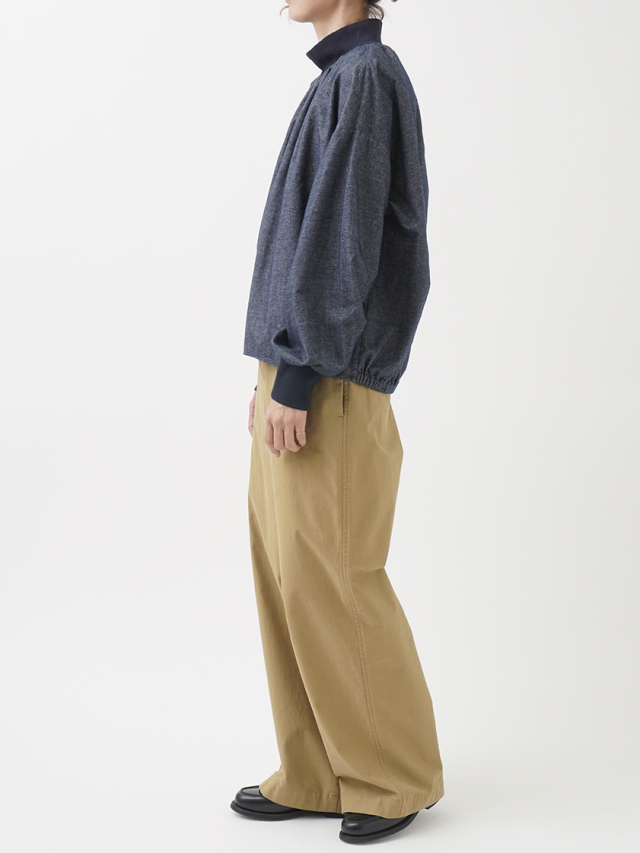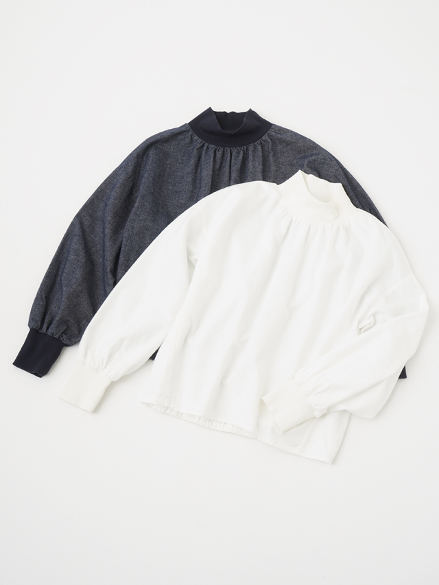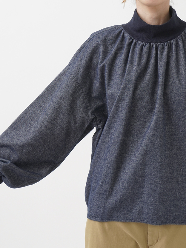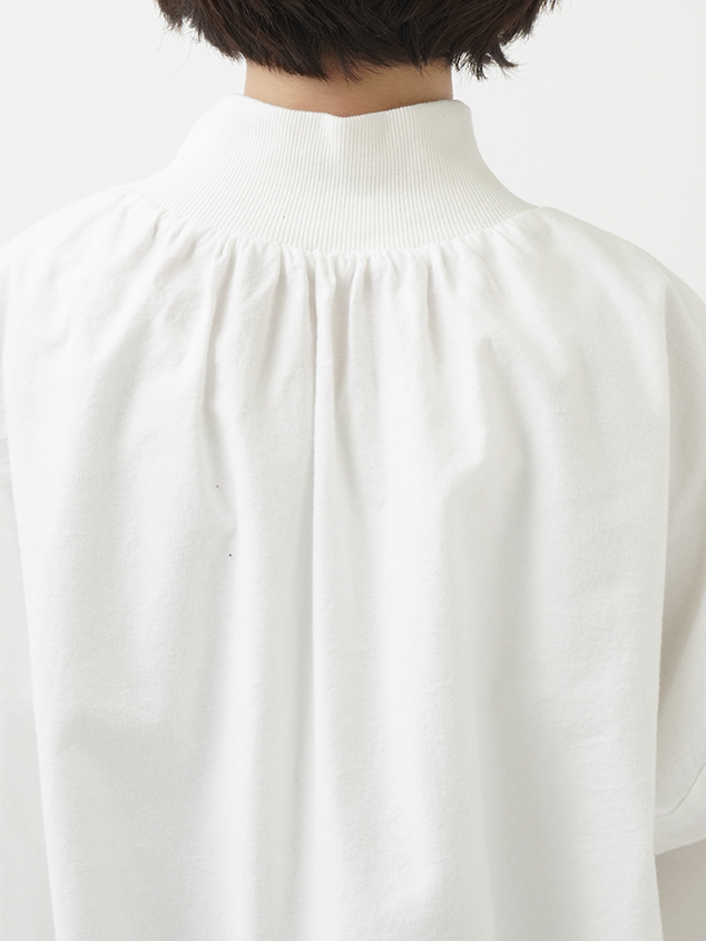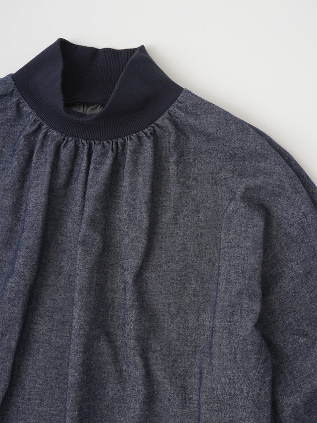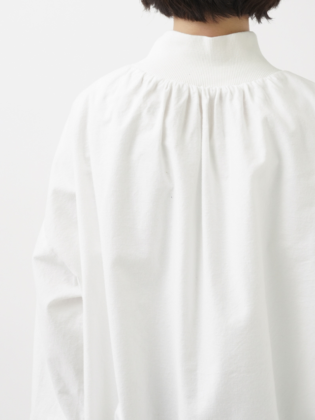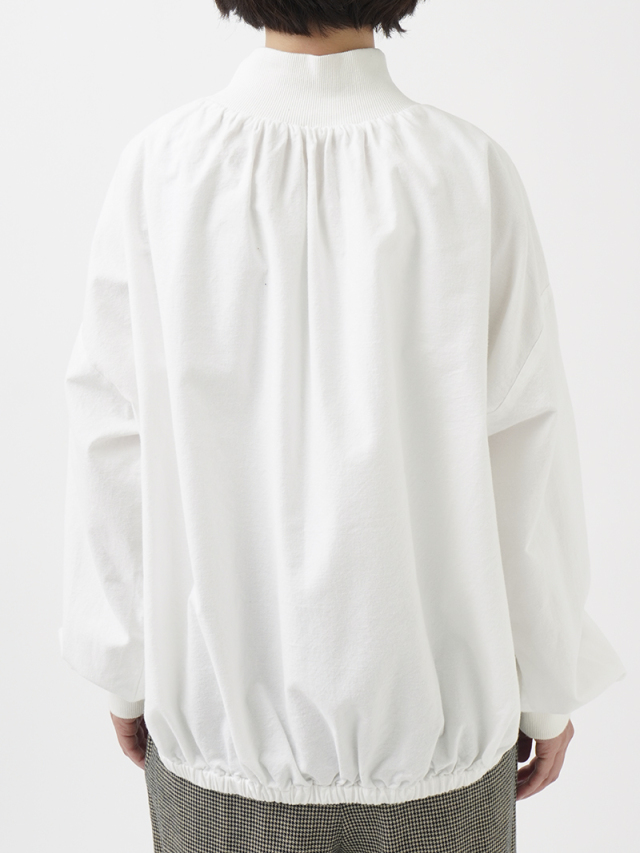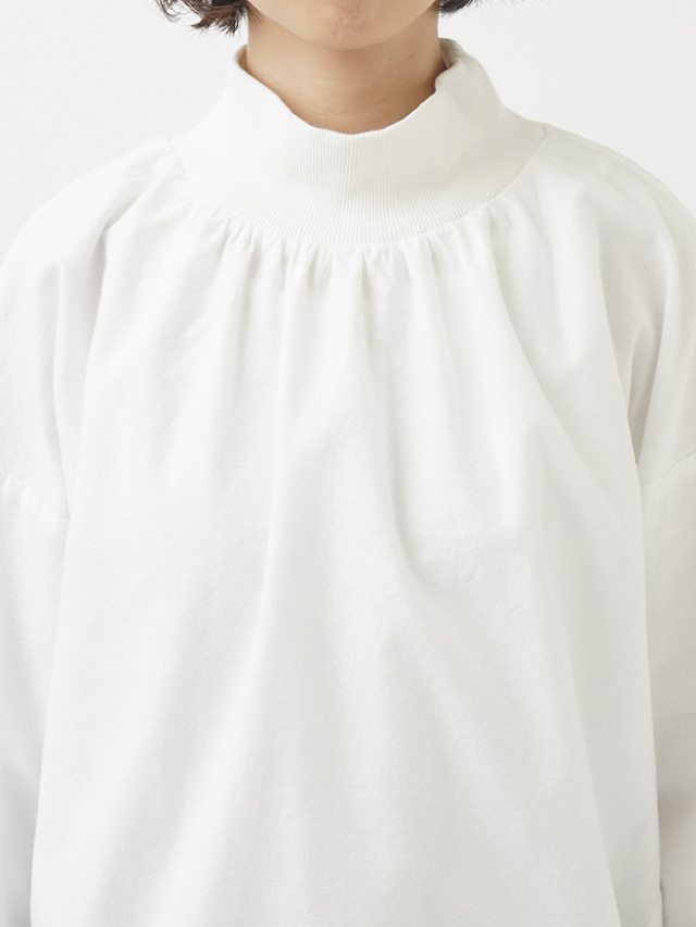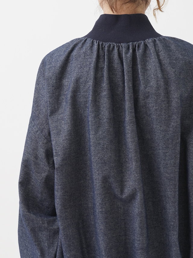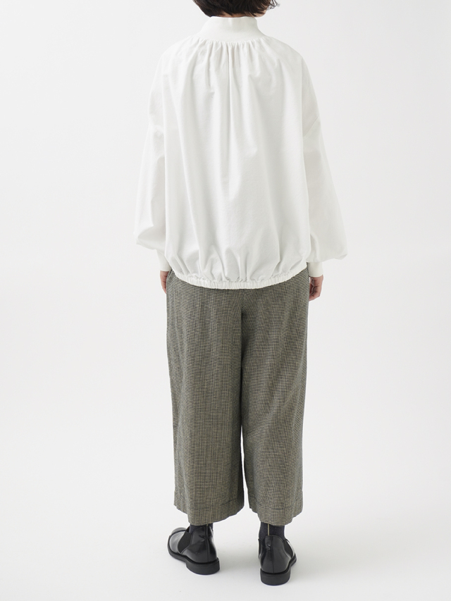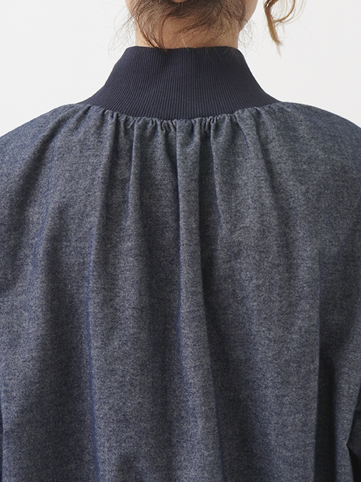 襟元、袖口のギャザーと、ゴムを通した後ろ裾が立体感のあるデザインです。