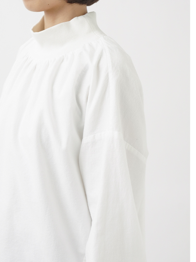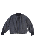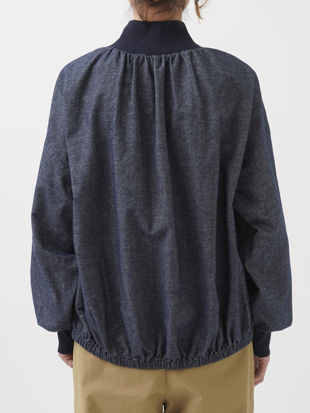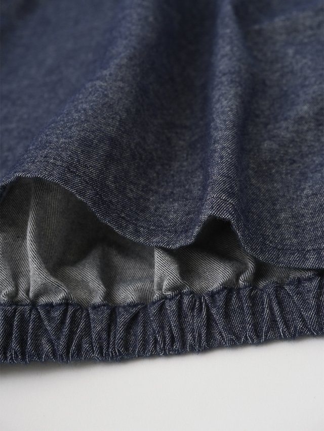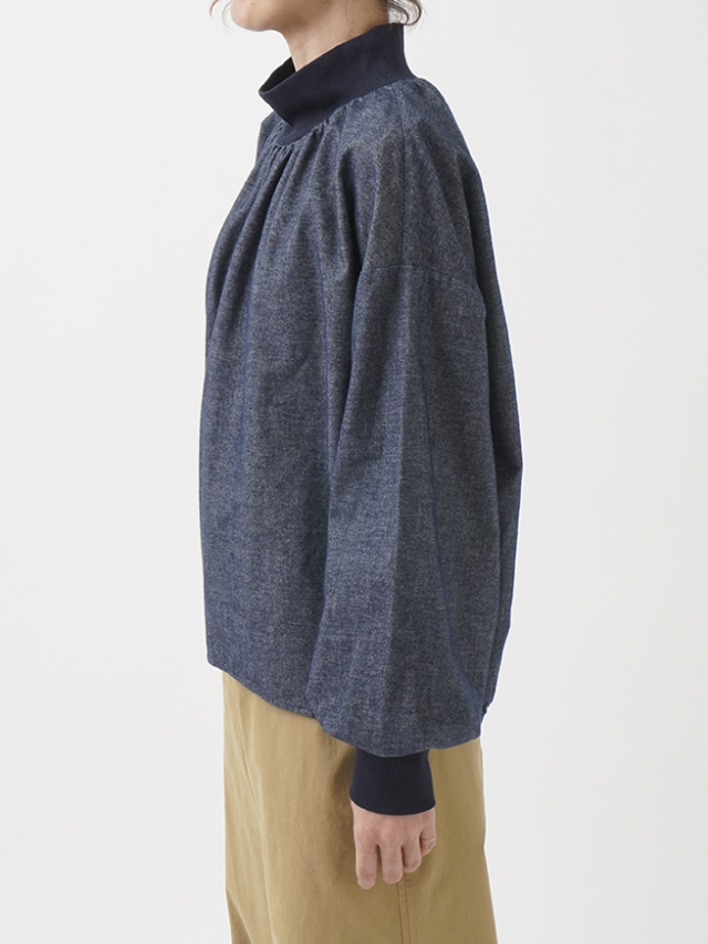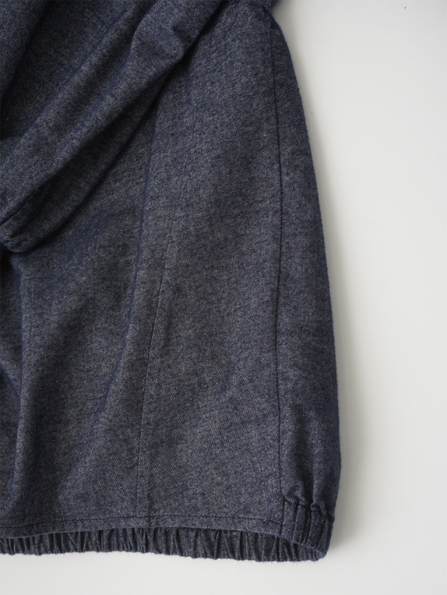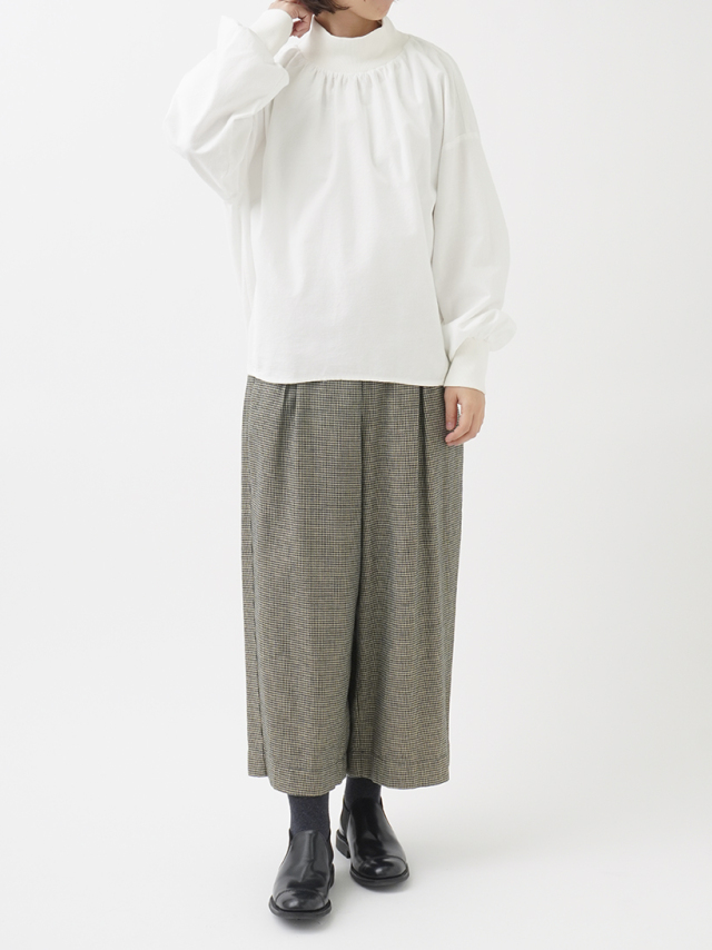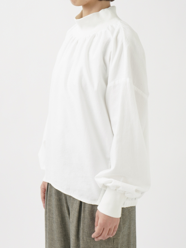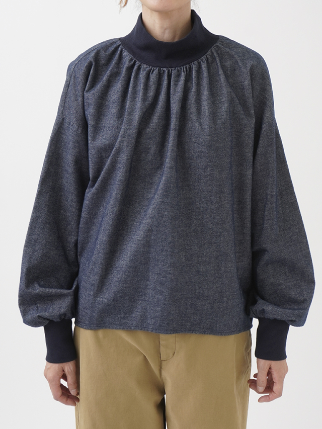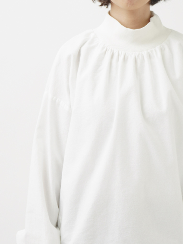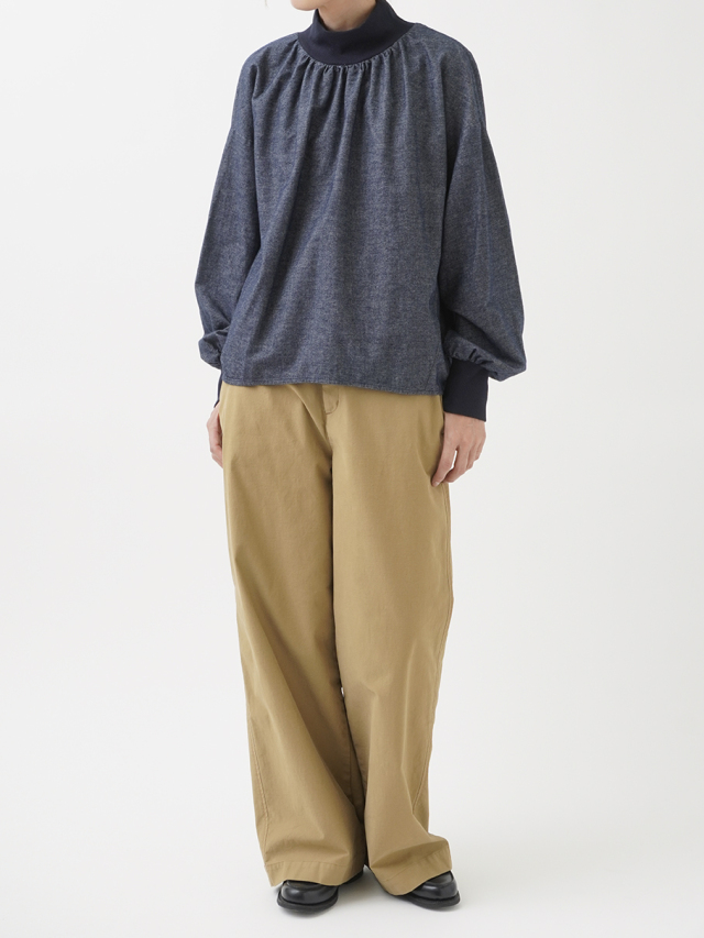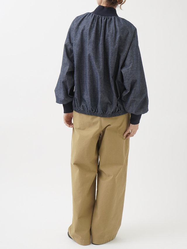 襟元、袖口のギャザーと、ゴムを通した後ろ裾が立体感のあるデザインです。