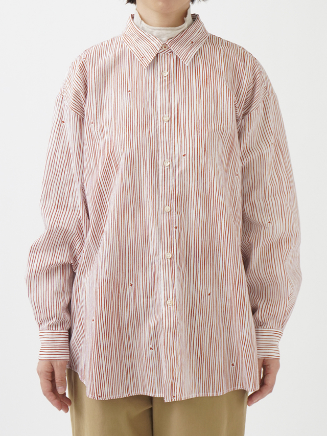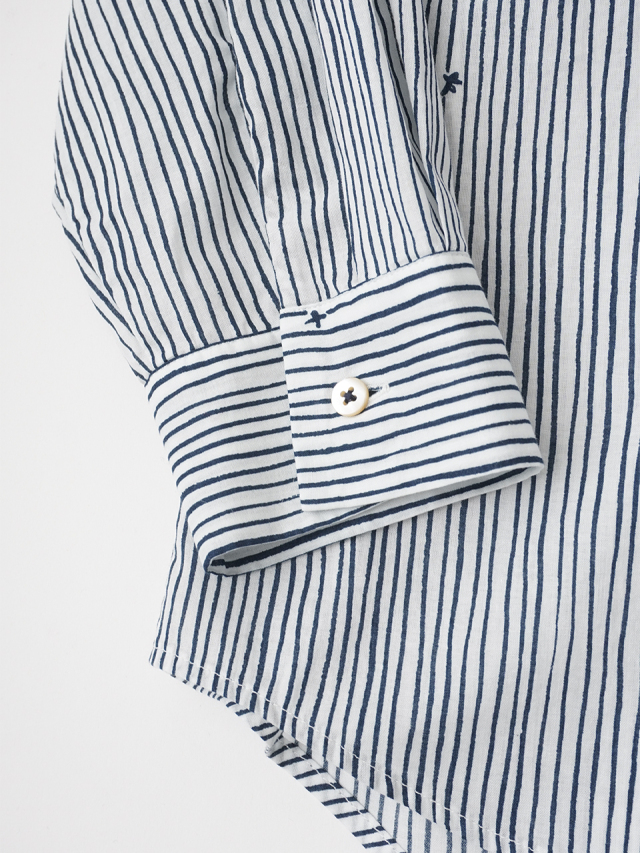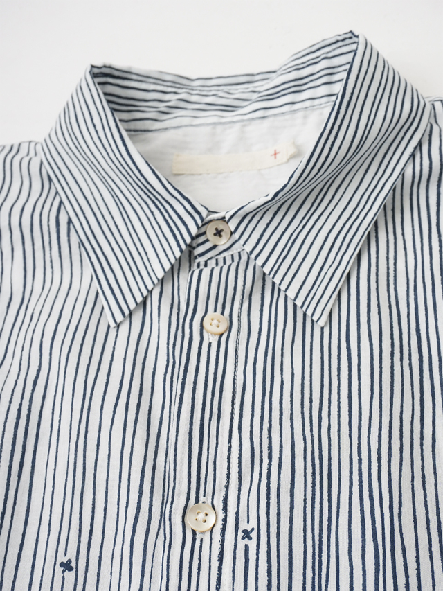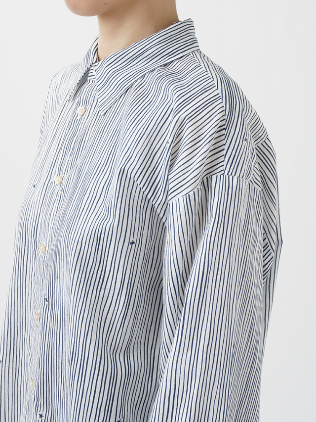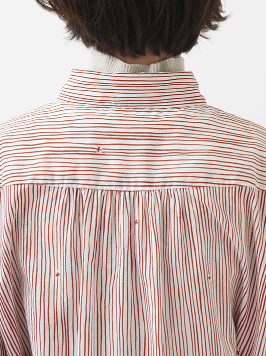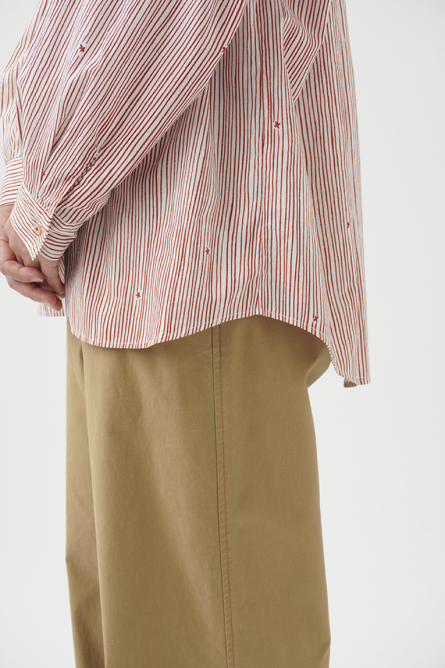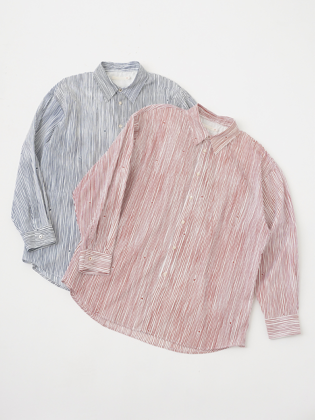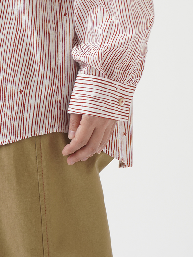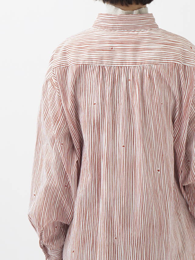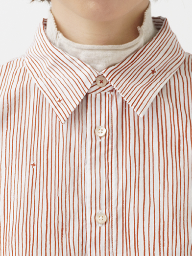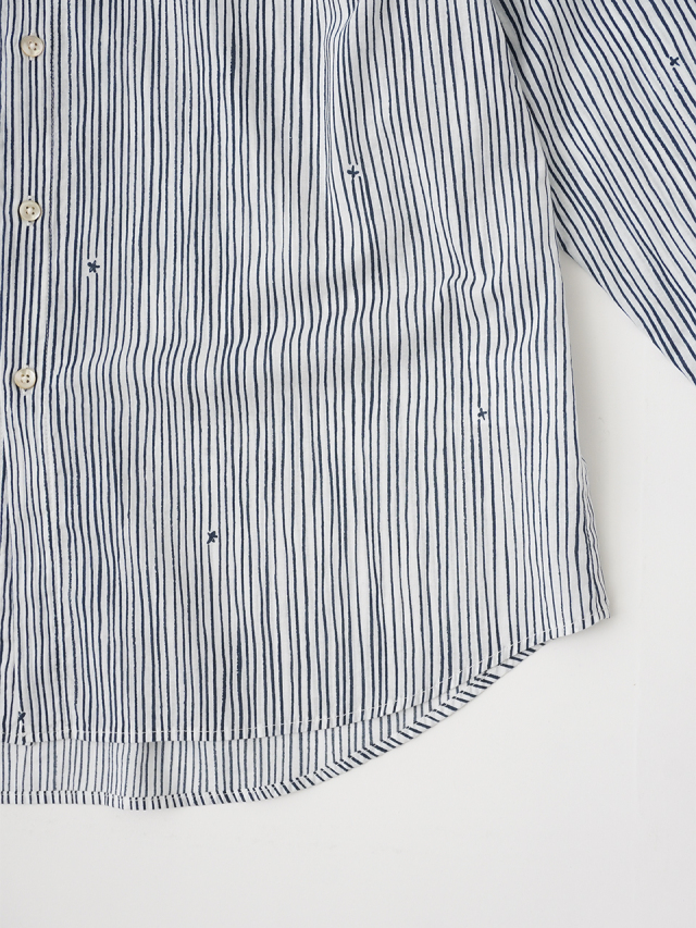 小さな金木犀の花を、ゆらぎのある縞の間に描いた柄のレギュラーシャツ。