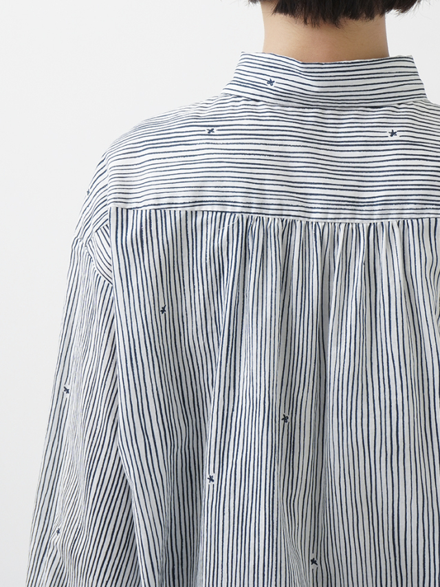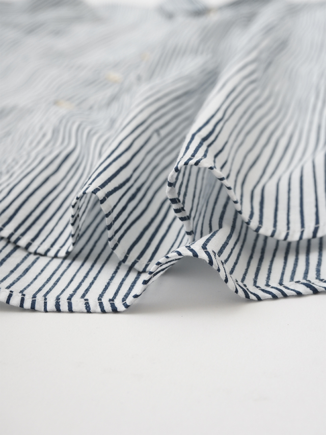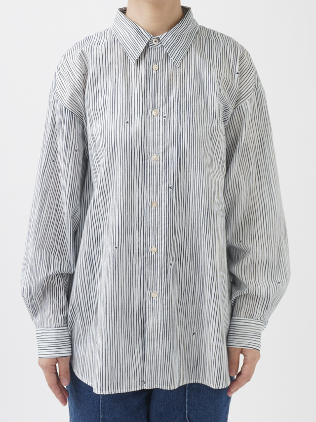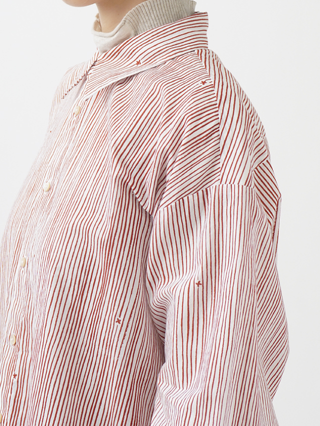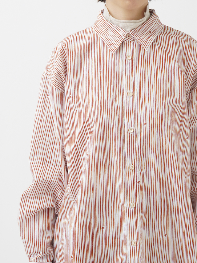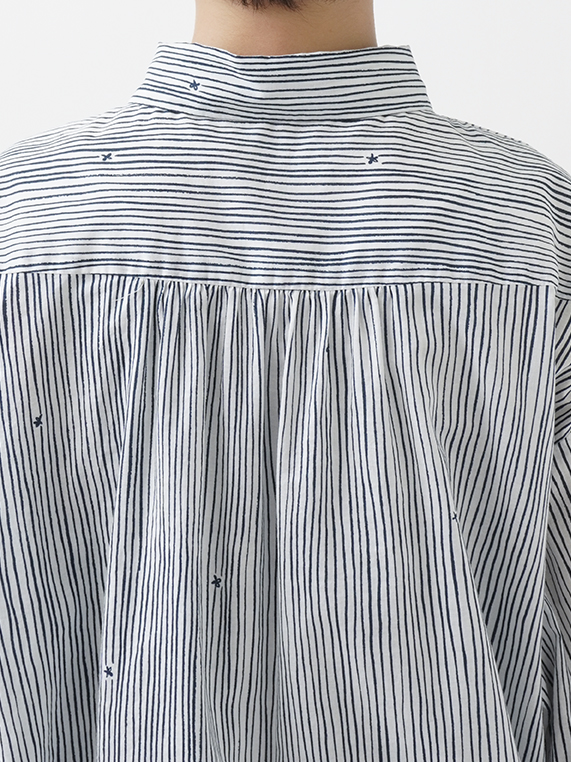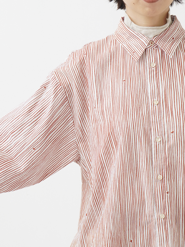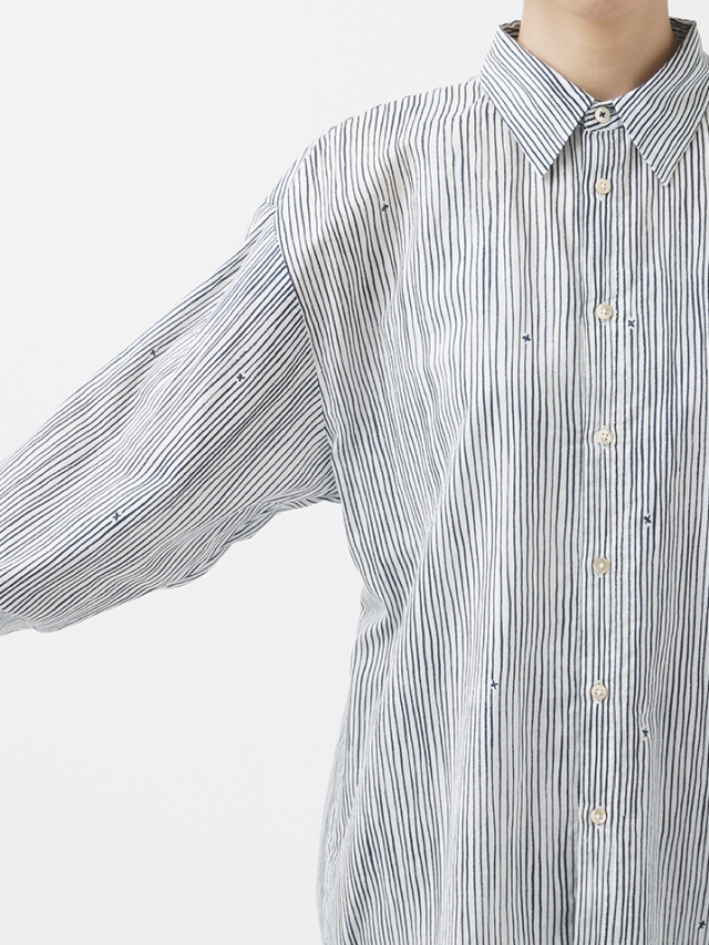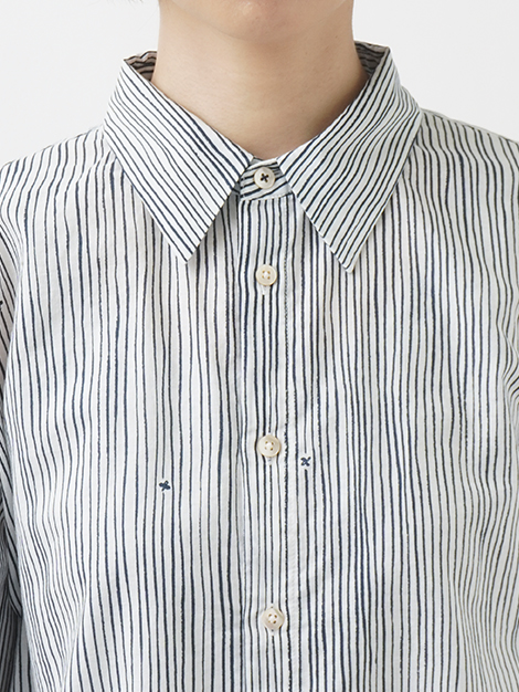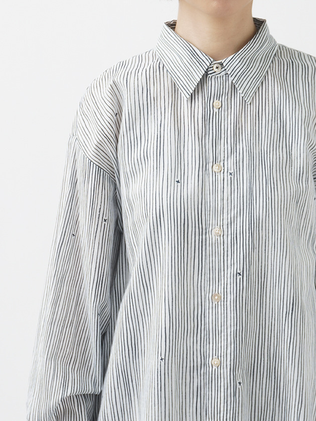 小さな金木犀の花を、ゆらぎのある縞の間に描いた柄のレギュラーシャツ。
