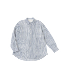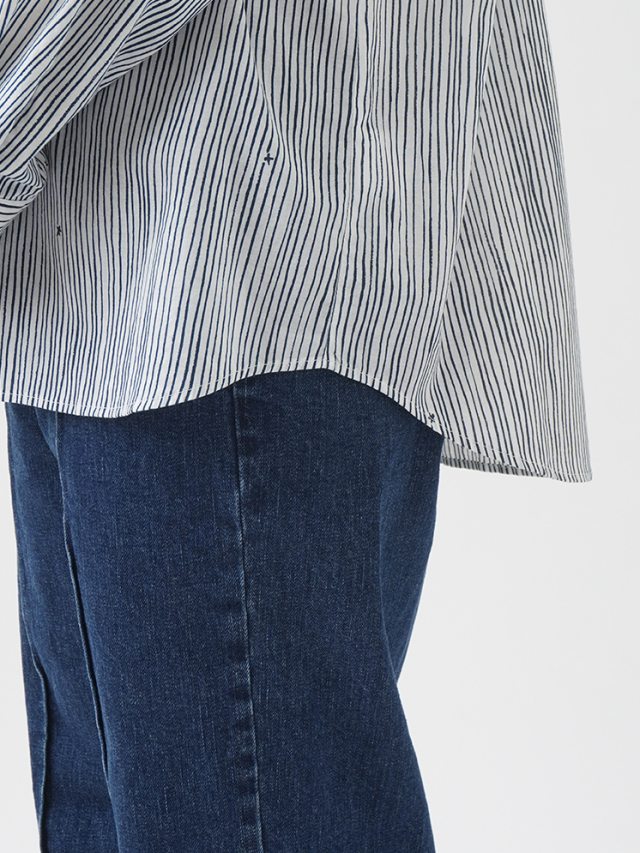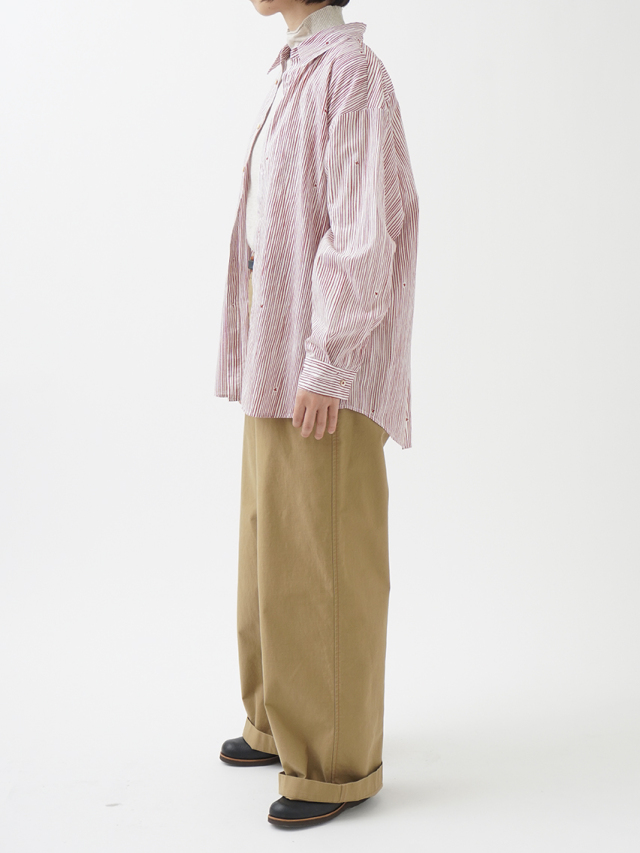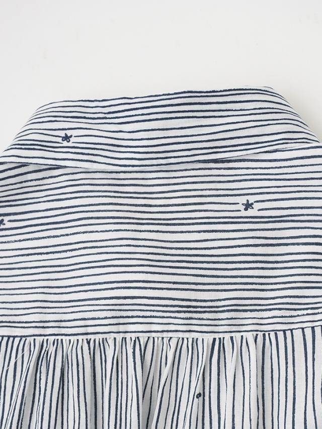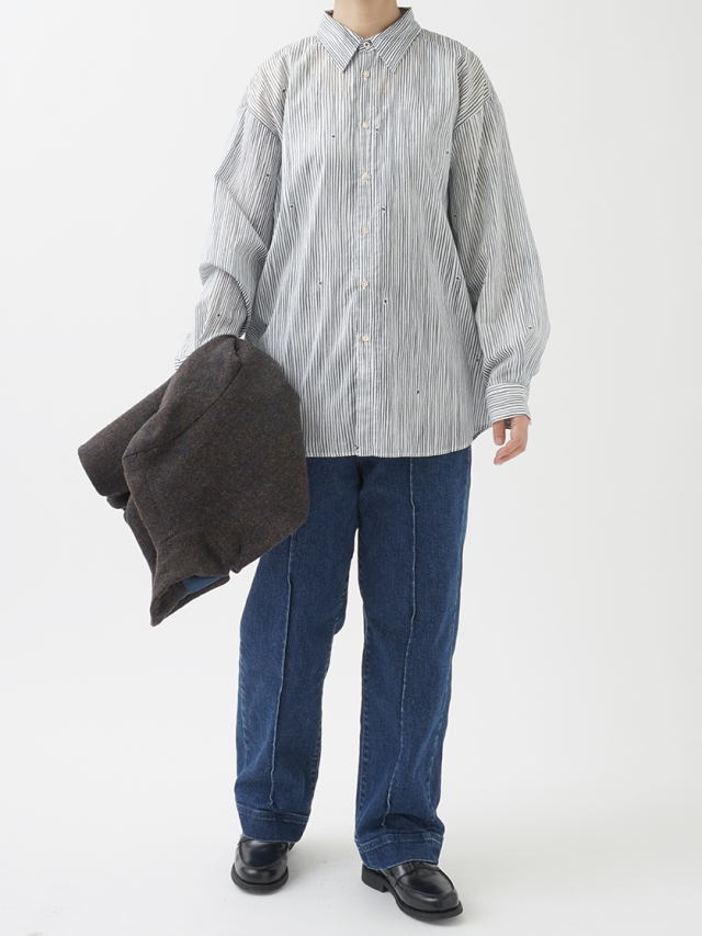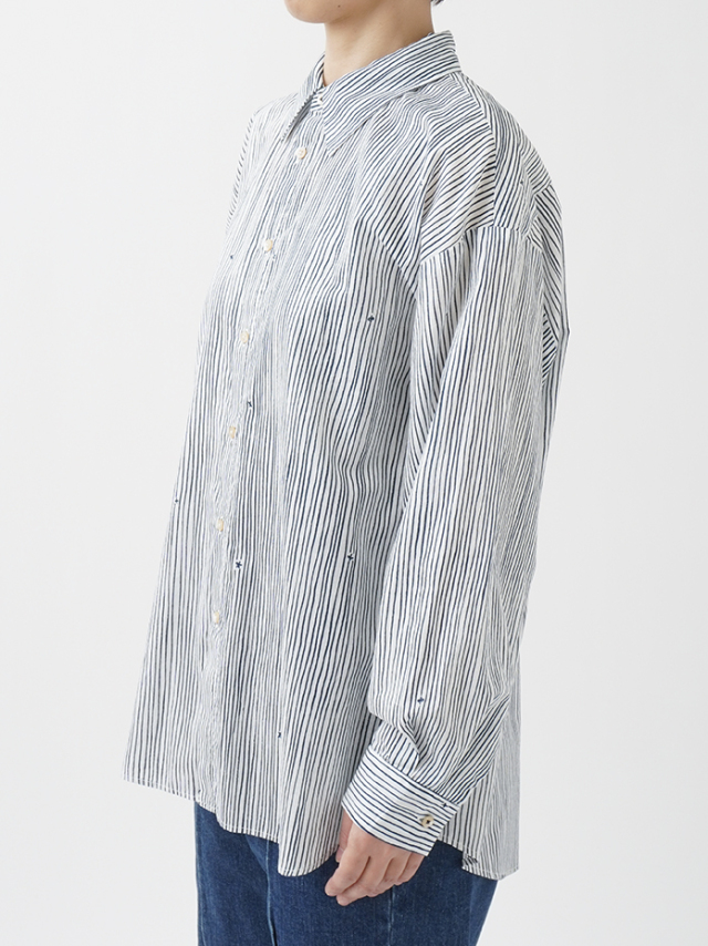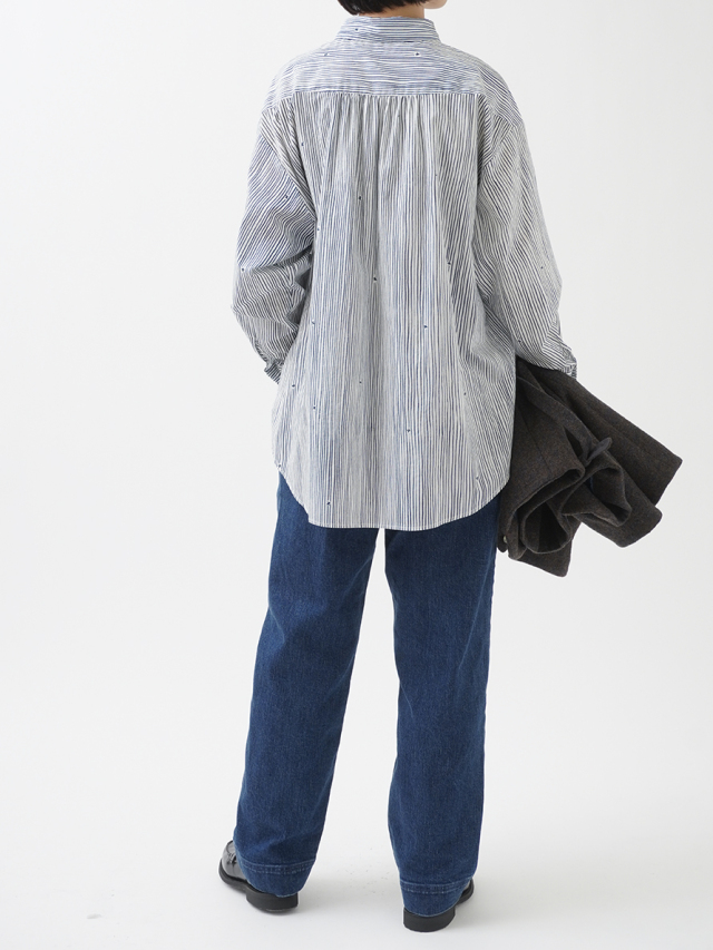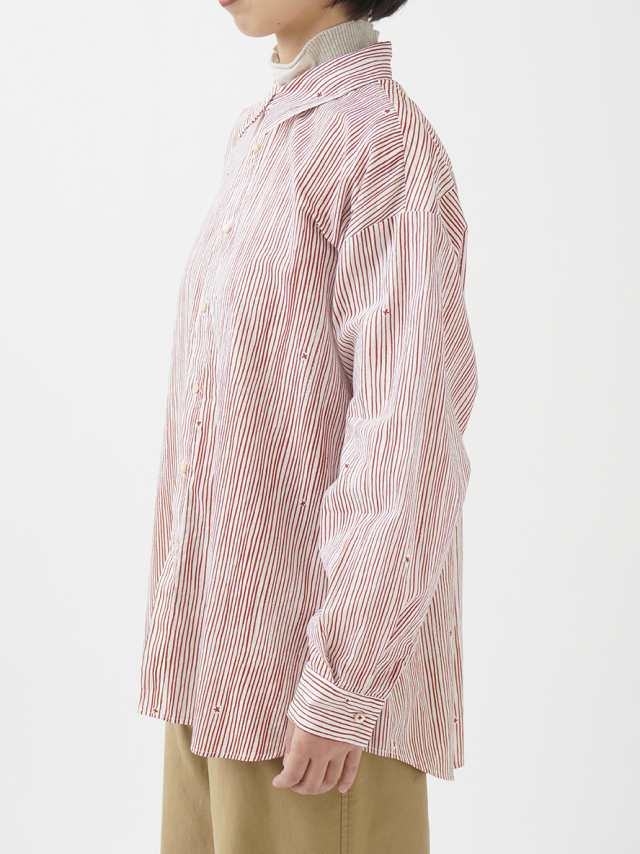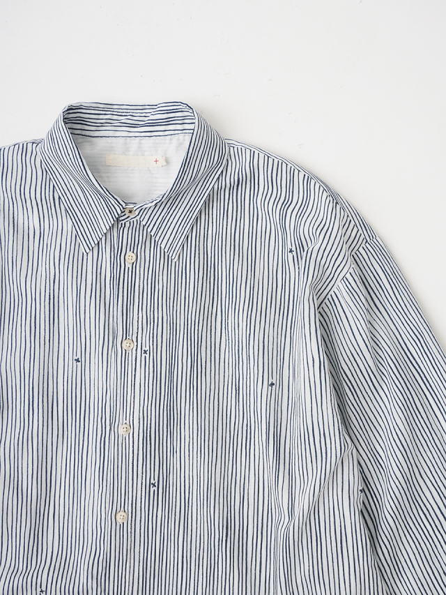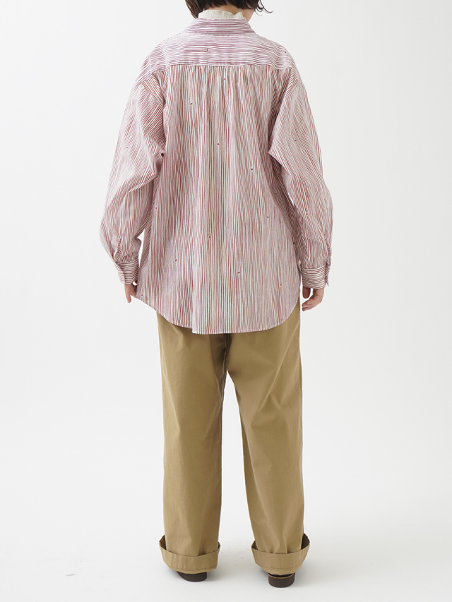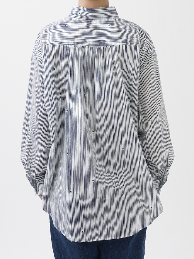 小さな金木犀の花を、ゆらぎのある縞の間に描いた柄のレギュラーシャツ。