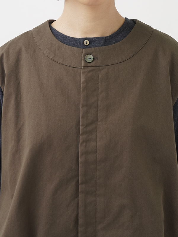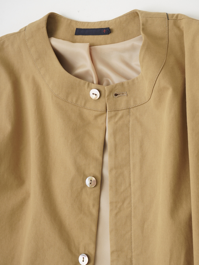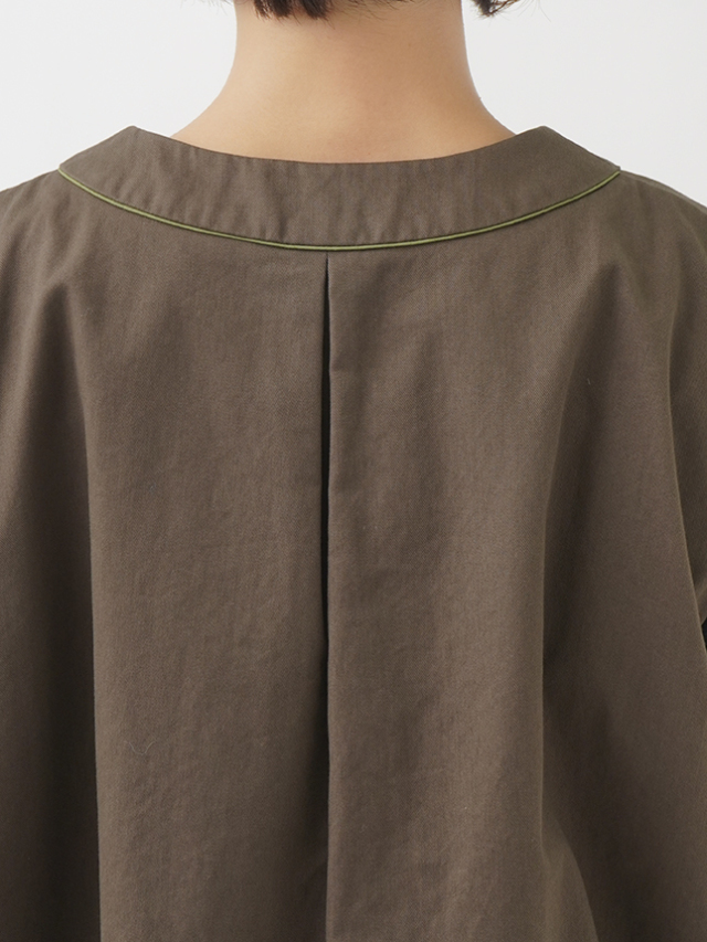 脇下、後ろ首元の配色パイピングや前後差のある裾のシルエットが際立つ、すっきりとした比翼ボタンのデザインです。